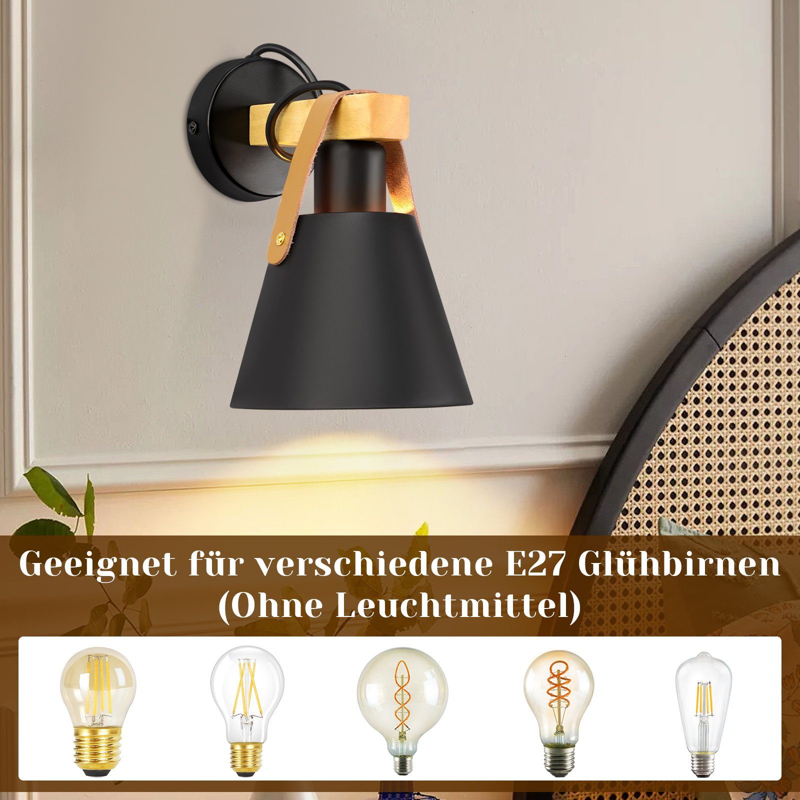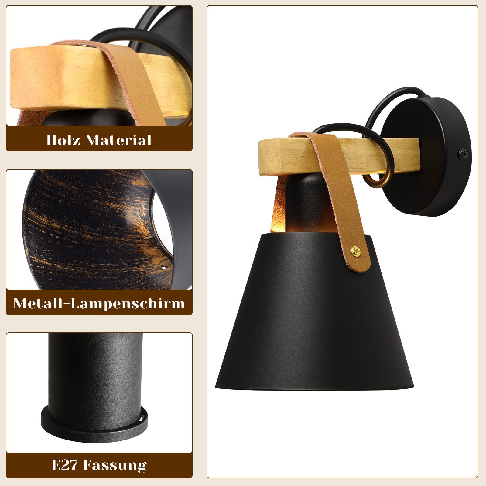 Vintage-tyylinen teollinen muotoilu: Tämän sisätilan seinävalaisimen puinen palkki, jossa on kevyt kumipuuviira ja musta muovinen lampunvarjostin nahkaelementillä, antaa seinävalaisimelle vintage-, rustiikkisen ja teollisen tyylin. Mitat: 14,5 * 12,5 * 21 cm (P * L * K); Lampunvarjostimen mitat: Φ14,5 * 11 cm; Materiaali: puu, muovi ja nahka; Jännite 230 V; Lamppu mukana: Ei; Kanta: E27 (MAX.40W)