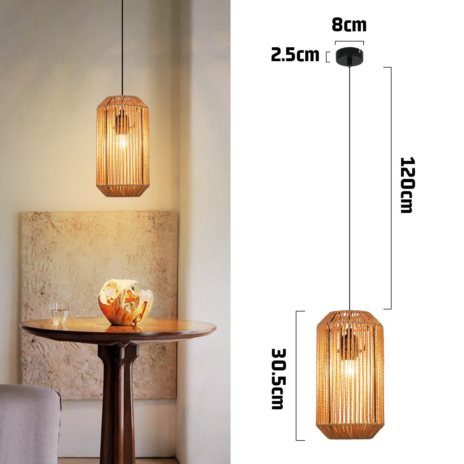 Tekniset tiedot: Koko: 16 cm x 16 cm x 154,5 cm, Lampun rungon pituus: 30,5 cm, Kattokiinnikkeen pituus: 8 cm, Ripustusnarun pituus: 120 cm; Lamppu: E27*1 (lamput eivät sisälly), Teho: Max 40W; Jännite: 230V