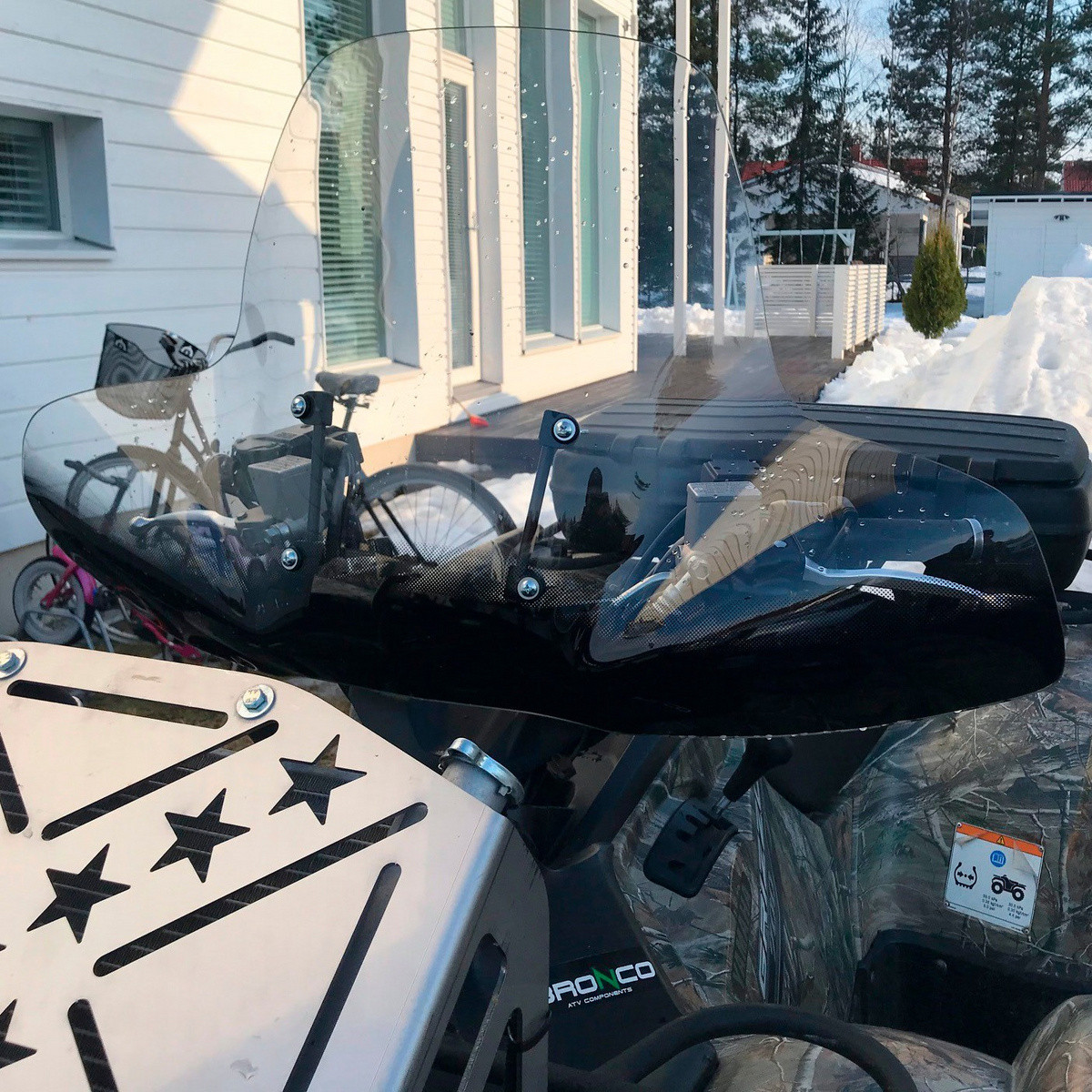 Tyylikäs yleismallin tuulisuoja mönkijöihin, joka suojaa kädet ja ylävartalon ajoviimalta. Kiinnikkeet sopivat halkaisijaltaan 22-25 mm ohjaustangolle. Sopii kaikkiin yleisimpiin mönkijämerkkeihin.