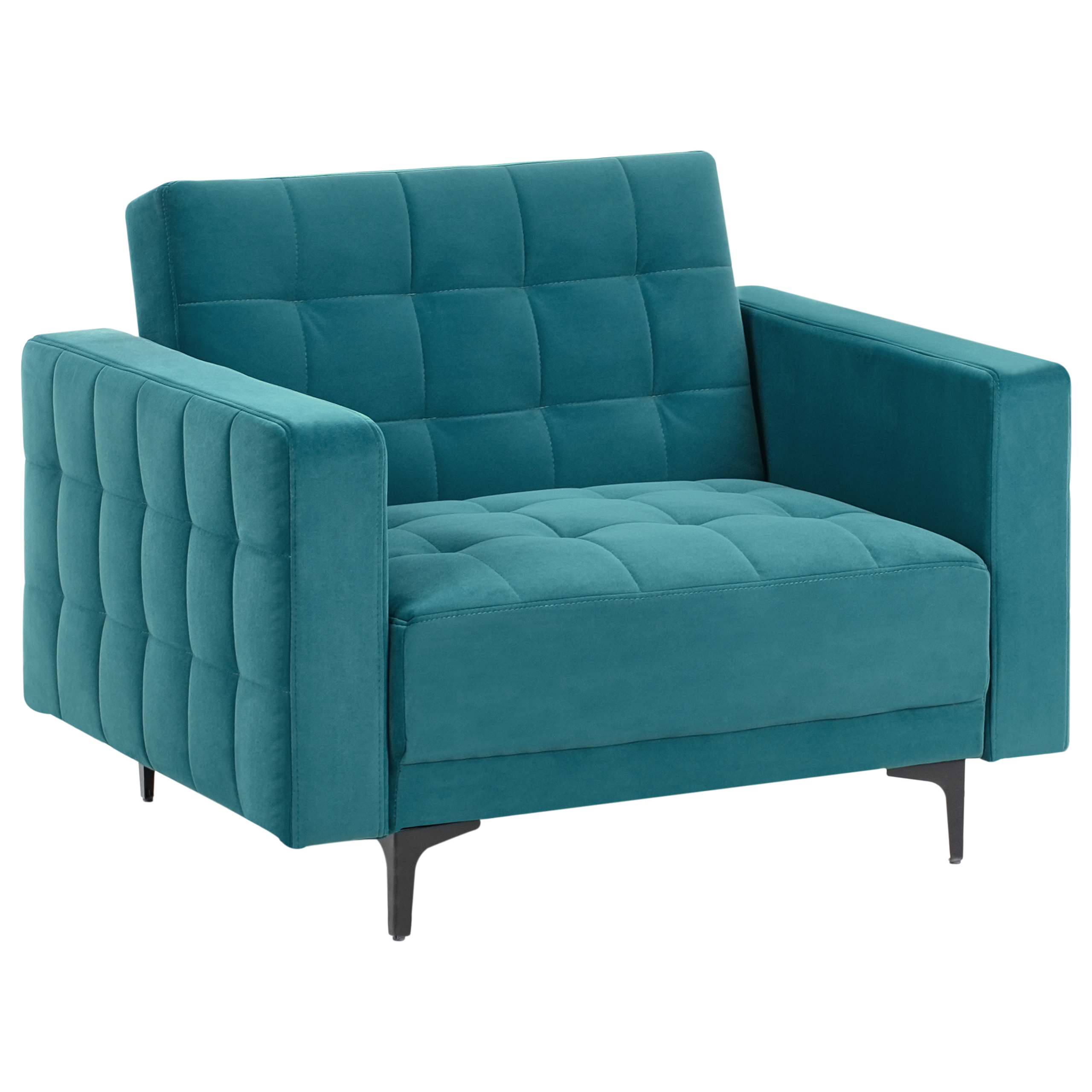 Moderni tuftattu modulaarinen nojatuoli. Puhtaat linjat ja mukavuus ovat tämän nojatuolin ominaisia piirteitä. Sen runko on verhoiltu kokonaan korkealaatuisella samettikankaalla ja viimeistelty tyylikkäällä tuftauksella. Säädettävän selkänojan avulla se muuttuu viihtyisäksi makuutuoliksi. Raikas merensininen väri sopii useisiin sisustuksiin ja värimaailmoihin. Modulaarisen muotoilunsa ansiosta se voidaan yhdistää muihin malliston kalusteisiin sopivan istuinkokonaisuuden luomiseksi. Se on erittäin vakaa mustien metallijalkojensa ansiosta.