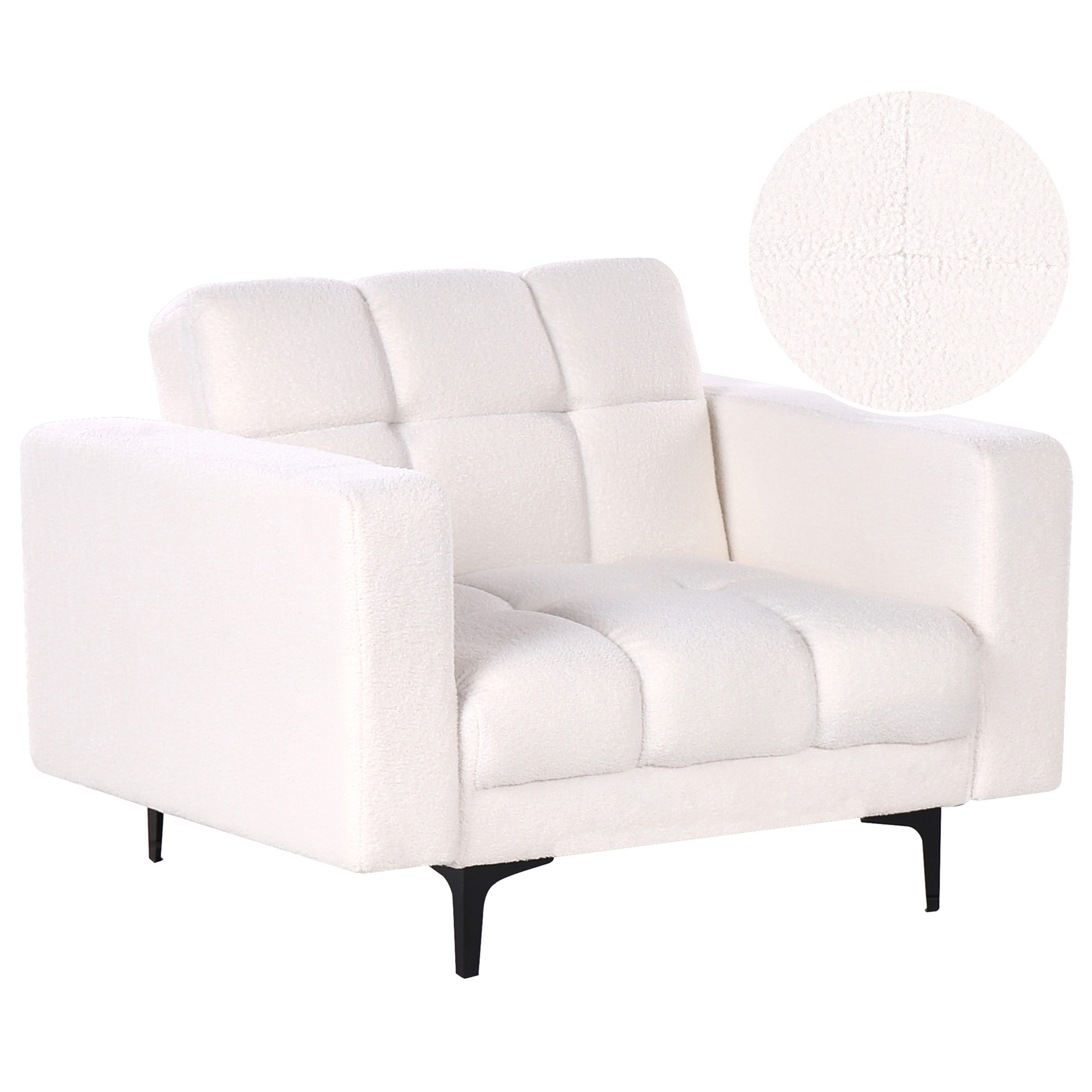 Minimalistinen tuftattu nojatuoli säädettävällä selkänojalla. Tuo olohuoneeseen pehmeä lisä tällä elegantilla nojatuolilla. Korkealaatuisella, erittäin pehmeällä bukleekankaalla verhoiltu tuoli tarjoaa mukavan paikan istua. Kolmeen asentoon säädettävä selkänoja lisää käyttömukavuutta. Hurmaava valkoinen väri ja tuftatut yksityiskohdat tekevät siitä kodikkaan mutta tyylikkään kokonaisuuden, joka kohottaa tilaa. Yhdistä se malliston muiden kappaleiden kanssa luodaksesi täydellisen rentoutumispaikan, joka sopii ainutlaatuiseen makuusi.