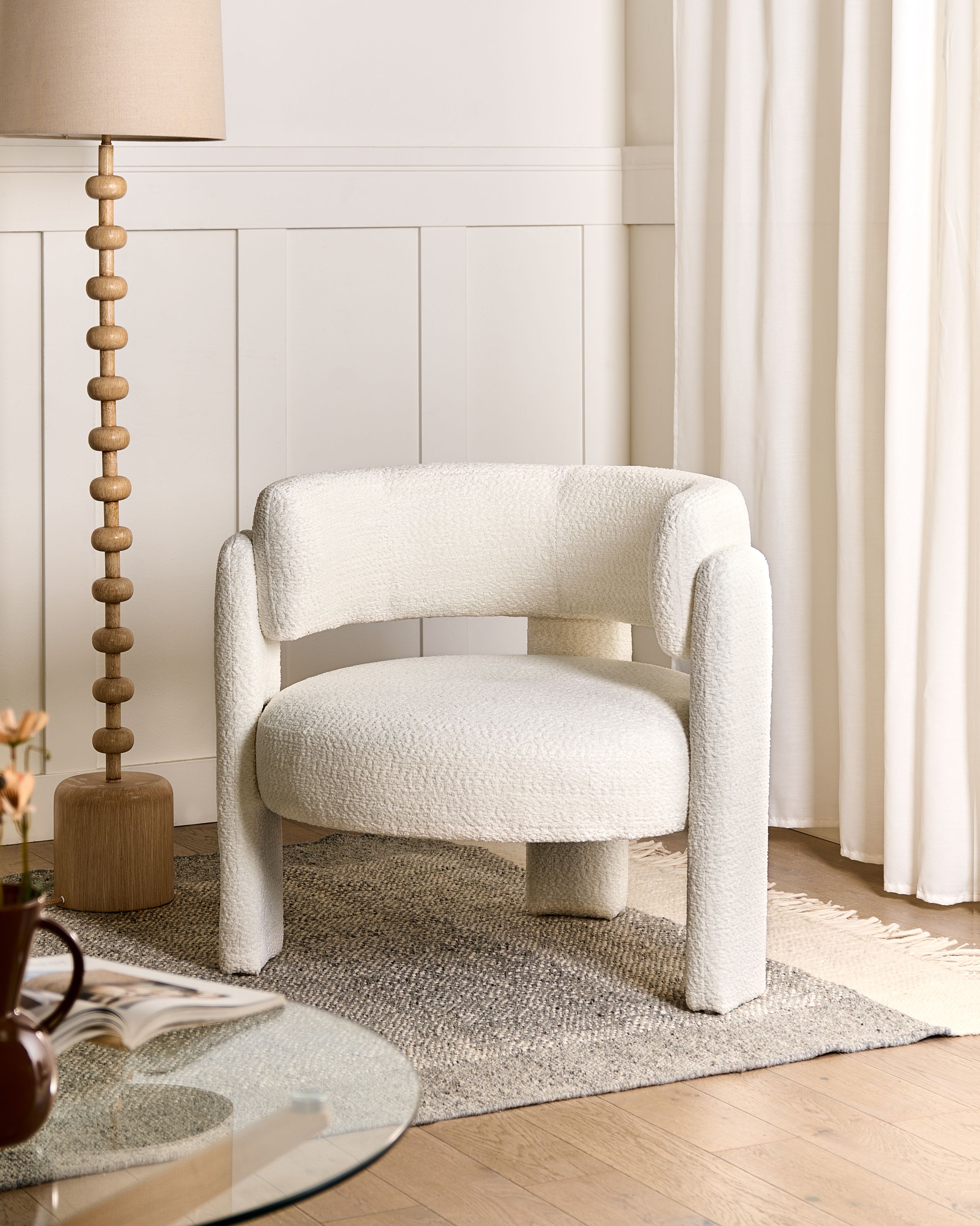 Pehmeä kaareva nojatuoli. Tämä moderni nojatuoli tuo ripauksen kodikasta mutta eleganttia tunnelmaa mihin tahansa tilaan. Pyöristetty istuin ja kaareva selkänoja takaavat mukavuuden, kun taas pehmeä, vaaleansävyinen chenilleverhoilu luo rauhallisen ja tyylikkään ilmeen. Nojatuoli sopii täydellisesti olohuoneeseen, makuuhuoneeseen tai rentoon nurkkaukseen.
