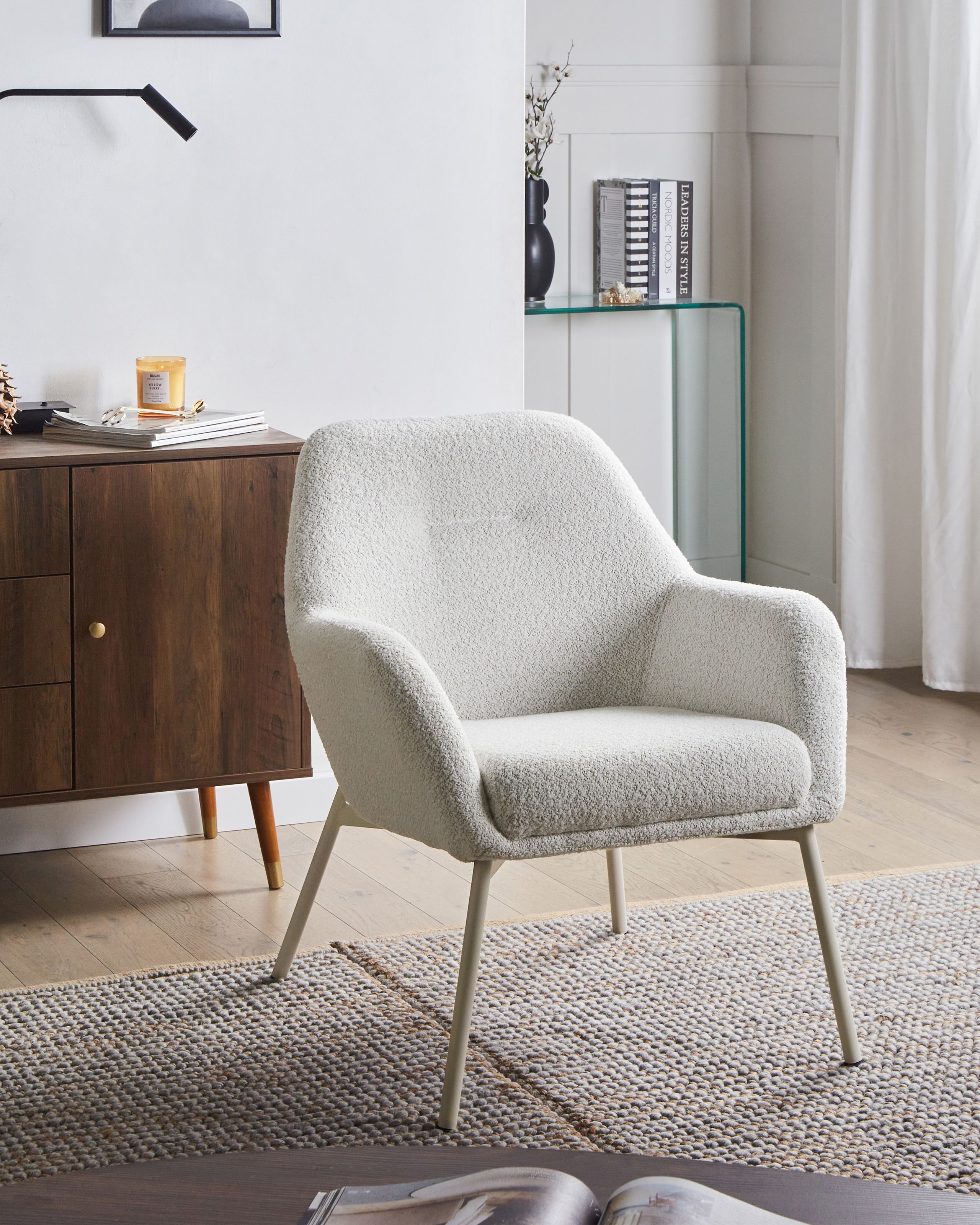 Moderni verhoiltu nojatuoli. Tuo tilaan mukavuutta ja tyyliä tällä virtaviivaisella nojatuolilla. Tukevat käsinojat, vankat rautajalat ja pehmeä, muhkea pehmustus tekevät siitä täydellisen paikan rentoutumiseen. Kestävä, hillityn sävyinen polyesteriverhoilu antaa tuolille raikkaan ilmeen. Moderni minimalistinen muotoilu sulautuu vaivattomasti monenlaisiin makuuhuoneisiin ja olohuoneisiin, luoden viihtyisän istumapaikan.