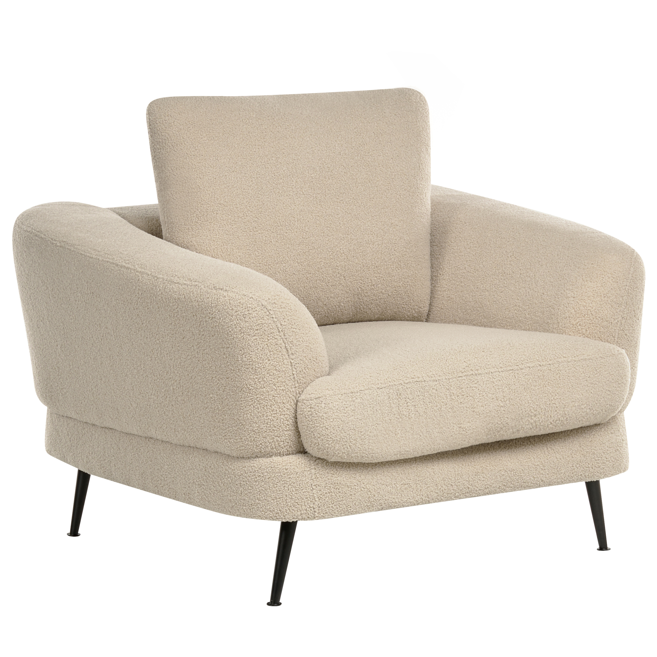 Moderni verhoiltu olohuoneen lepotuoli. Tämä nojatuoli tuo sisustukseen ripauksen eleganssia modernilla muotoilullaan ja monipuolisella vetovoimallaan. Kestävällä, miellyttävällä bukleekankaalla verhoiltu tuoli tarjoaa sekä mukavuutta että hienostunutta tekstuuria. Selkätyyny ja pyöristetyt käsinojat luovat kutsuvan ilmeen, kun taas tukevat rautajalat takaavat vakauden, mikä tekee nojatuolista täydellisen lisän olohuoneeseen tai kodikkaan makuuhuoneen lukunurkkaukseen.