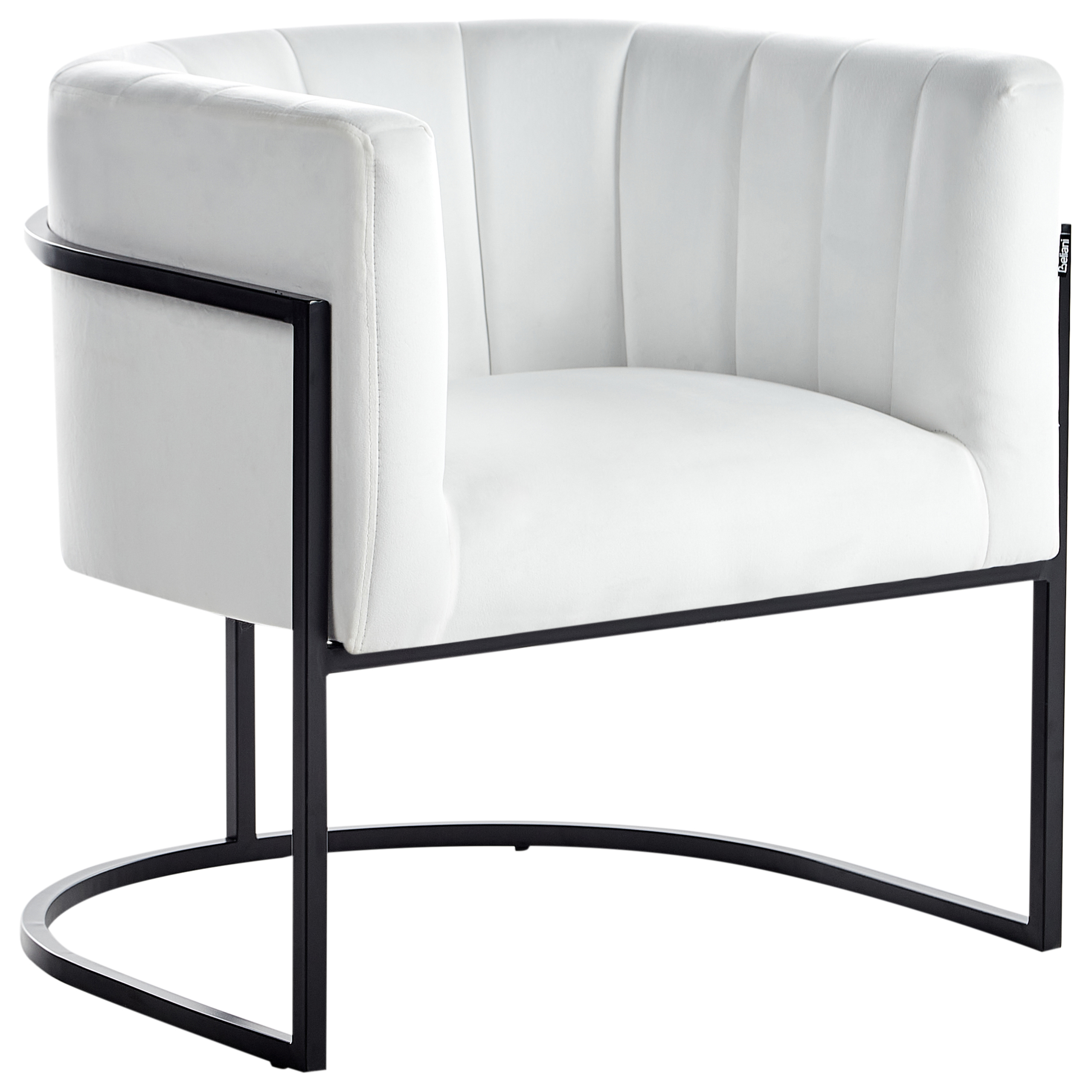 Glamour-tyylinen nojatuoli teräsrungolla. Tämä puhdaslinjainen ja yksinkertaisen muotoilun omaava nojatuoli sulautuu erinomaisesti moderneihin tai vintage-tyylisiin sisustuksiin. Pehmeällä ja helppohoitoisella valkoisella samettikankaalla verhoillussa tuolissa on matala, kaareva selkänoja, jonka pystytikkaus muistuttaa simpukkaa. Tukevien, ruostumattomasta teräksestä valmistettujen mustien jalkojen ansiosta se on sekä vakaa että tyylikäs, tuoden tilaan vanhan Hollywoodin glamour-tyyliä.