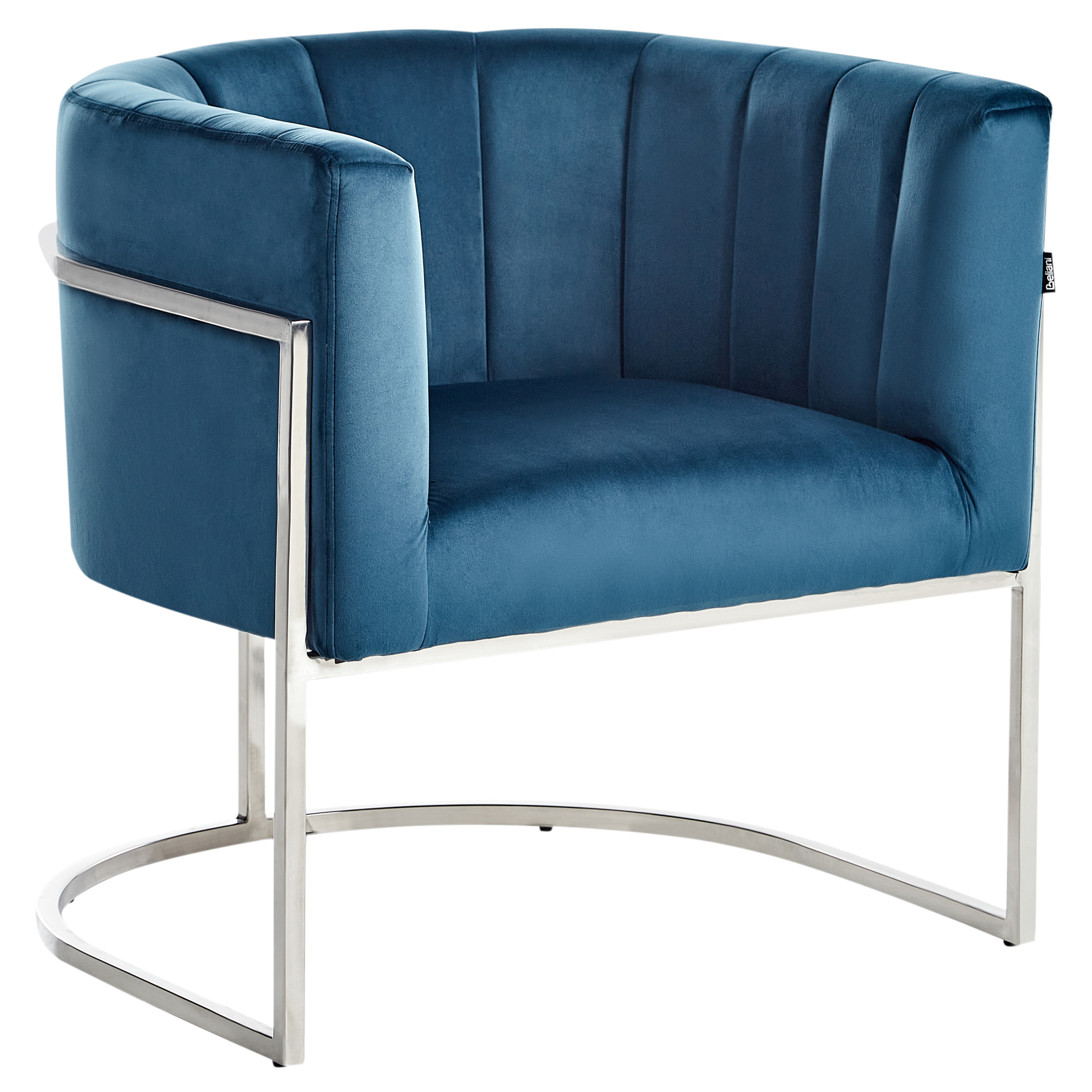 Kaunis samettinen nojatuoli. Tämä puhdaslinjainen ja yksinkertaisen muotoilun omaava nojatuoli sulautuu erinomaisesti moderneihin tai vintage-tyylisiin sisustuksiin. Pehmeällä ja helppohoitoisella sinisellä samettikankaalla verhoillussa tuolissa on matala, kaareva selkänoja, jonka pystytikkaus muistuttaa simpukkaa. Tukevien, ruostumattomasta teräksestä valmistettujen hopeanväristen jalkojen ansiosta se on sekä vakaa että tyylikäs, tuoden tilaan vanhan Hollywoodin glamour-tyyliä.