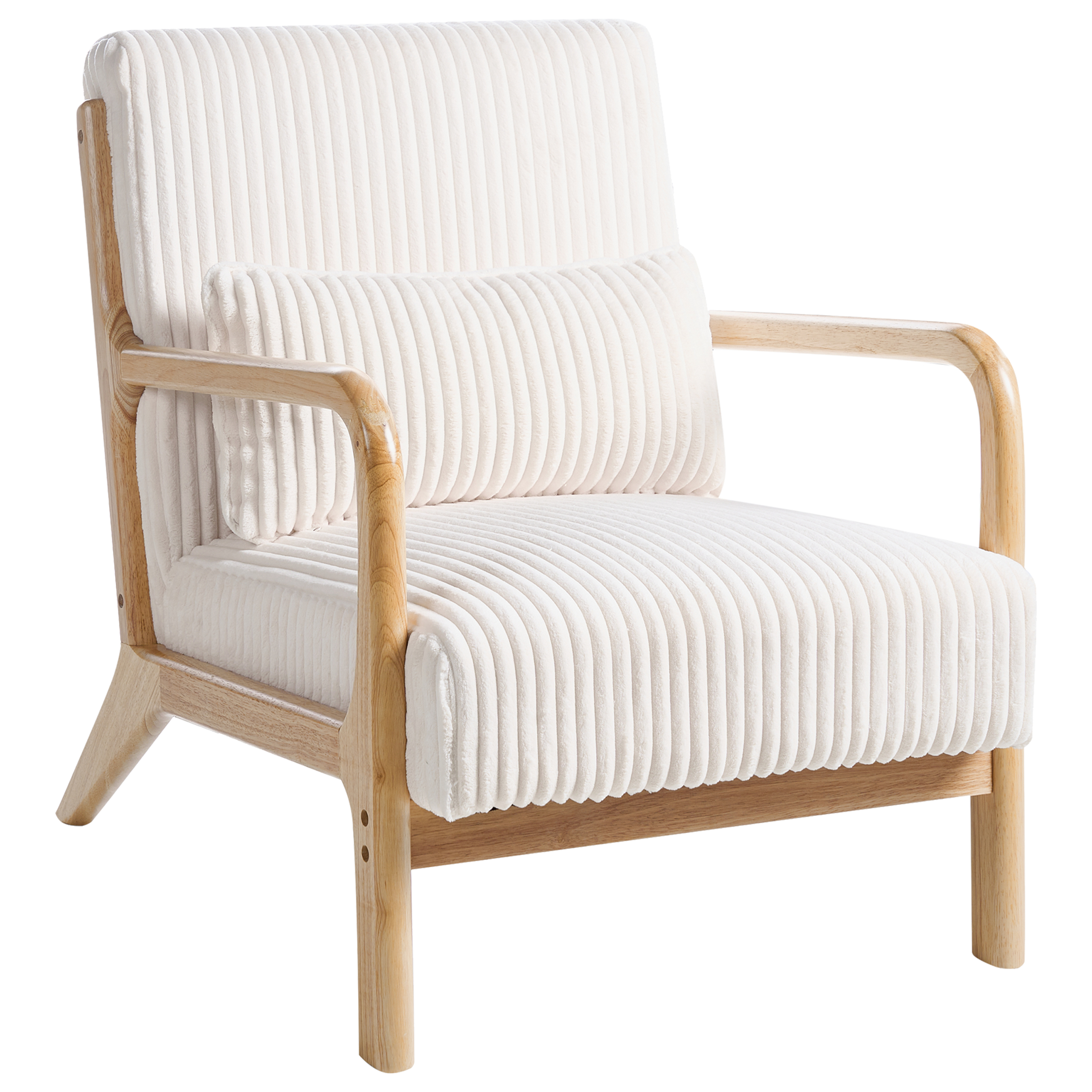 Vintage-tyylinen nojatuoli koristetyynyllä. Tämä nojatuoli yhdistää puhtaan skandinaavisen muotoilun hienovaraiseen vintage-tunnelmaan, mikä tekee siitä tyylikkään lisän jokaiseen moderniin kotiin. Pehmeällä valkoisella vakosametilla verhoiltu nojatuoli tuntuu raikkaalta ja monipuoliselta, mutta säilyttää kodikkaan ilmapiirin. Matala, kumipuusta valmistettu runko ja pehmeästi pyöristetyt käsinojat lisäävät lämpöä ja tasapainoa, minkä ansiosta se on elegantti ja kutsuva.