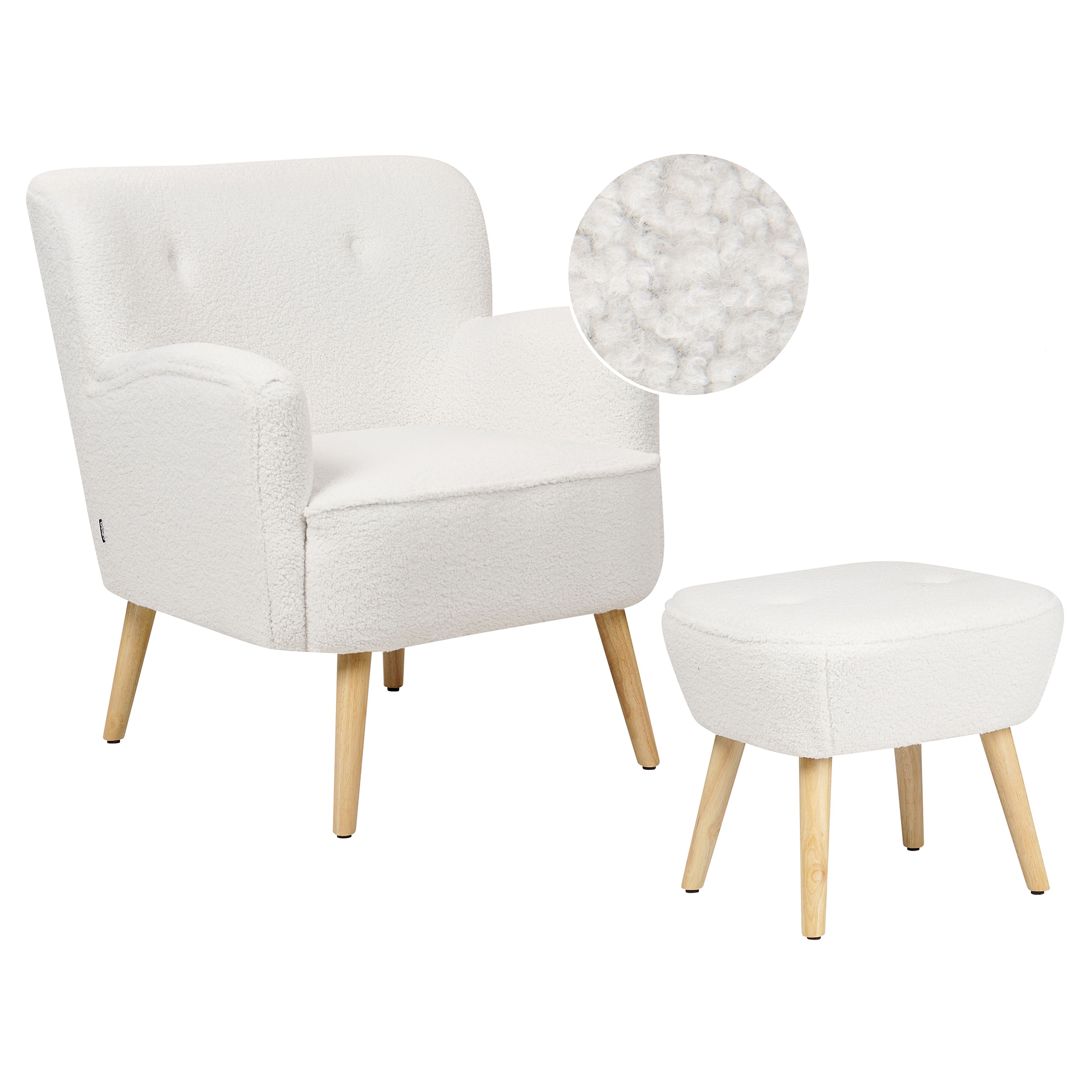 Retrotyylinen nojatuoli jakkaralla. Luo olohuoneeseesi täydellinen paikka rentoutumiseen tällä tyylikkäällä nojatuolilla ja rahilla. Molemmat kalusteet on verhoiltu erittäin miellyttävän tuntuisella bukleekankaalla, joka tuo niihin kodikkuutta ja charmia. Matalan selkänojan, pyöristettyjen muotojen sekä hienovaraisten koristenappien ansiosta se on ihanteellinen lisä sekä retrotyylisiin että moderneihin sisustuksiin. Tukevat kumipuujalat tarjoavat vakauden, korostaen nojatuolin trendikästä väriä.