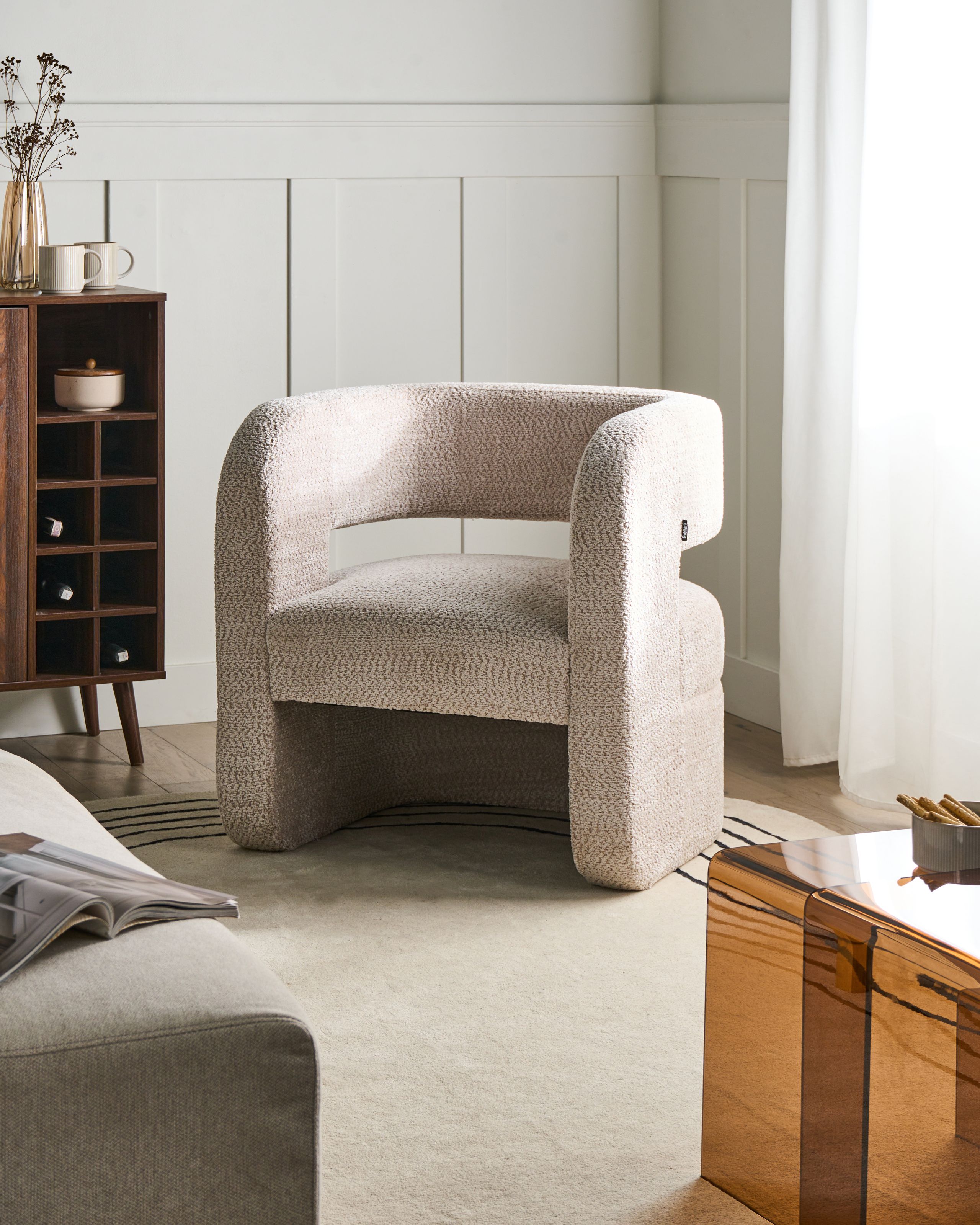 Verhoiltu nojatuoli leveällä istuimella. Lisää kotiin mukavuutta ja tyyliä tällä modernilla nojatuolilla. Pehmeä chenilleverhoilu antaa miellyttävän tuntuman, ja ainutlaatuinen selkänoja on suunniteltu tarjoamaan parasta mahdollista tukea. Se tarjoaa mukavan istuinratkaisun, olitpa käpertynyt kirjan pariin tai viihdyttämässä vieraita. Tyylikäs muotoilu ja neutraali sävy sulautuvat vaivattomasti monenlaisiin sisustuksiin ja lisäävät eleganssia mihin tahansa huoneeseen.