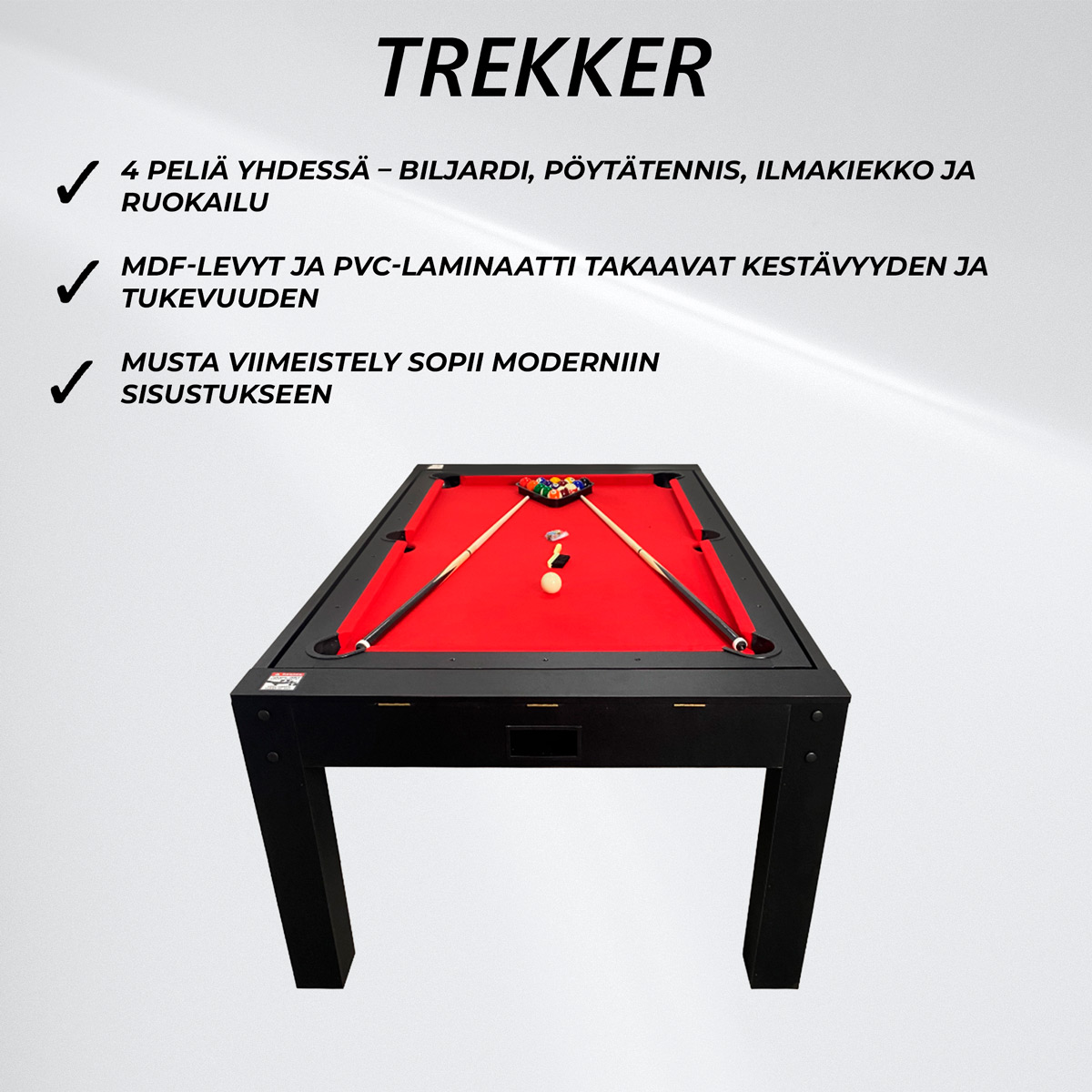 Monipuolisuus – Yhdessä pöydässä neljä eri käyttötarkoitusta: biljardi, pöytätennis, ilmakiekko ja ruokapöytä. Tilansäästö – Täydellinen koteihin, joissa halutaan maksimoida tila ja monikäyttöisyys. Kestävä rakenne – MDF ja PVC-laminaatti takaavat pitkän käyttöiän ja tukevuuden. Valmiina pelaamiseen – Kaikki pelivälineet sisältyvät pakkaukseen, ei erillisiä hankintoja. Tyylikäs design – Musta viimeistely tekee pöydästä näyttävän osan sisustusta.