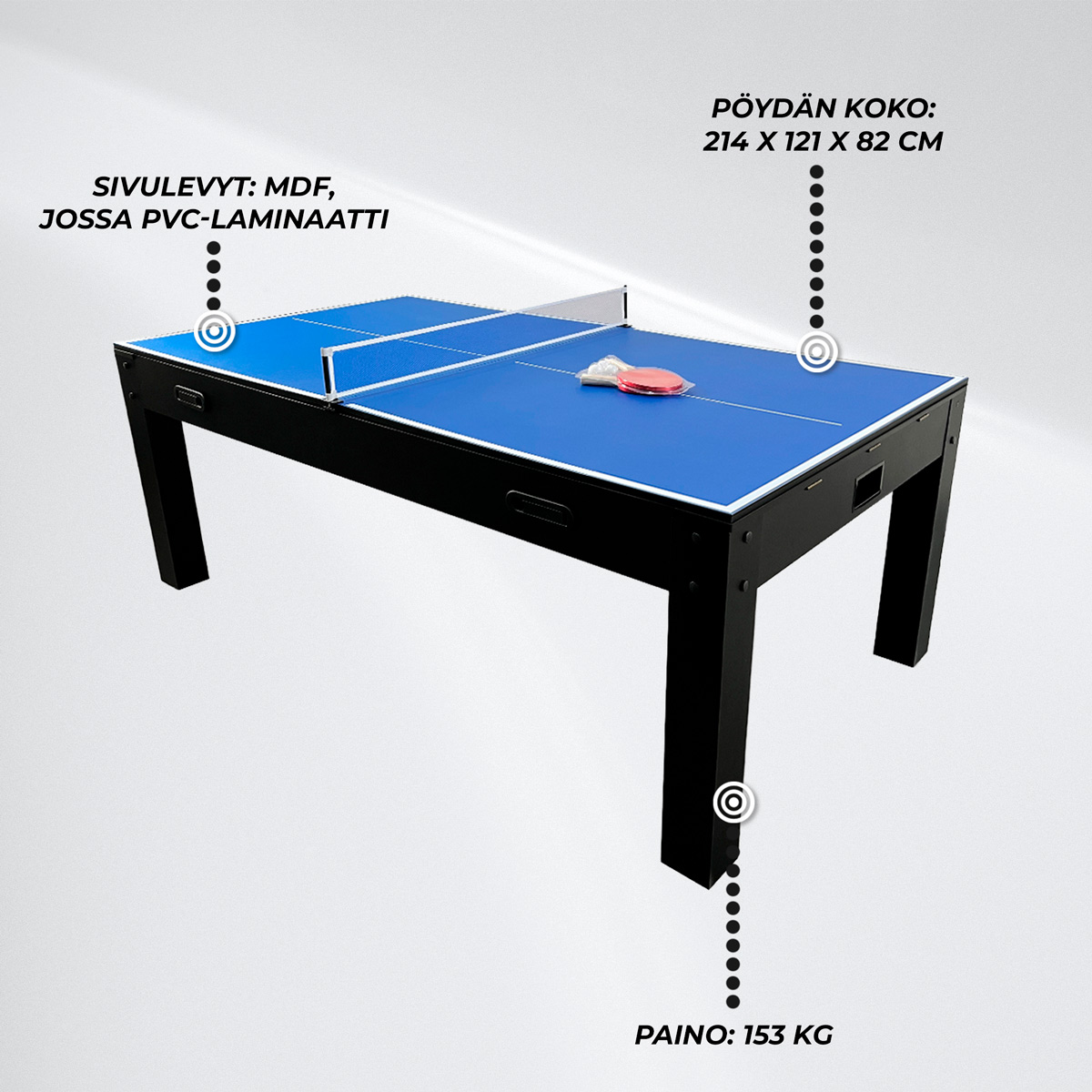 Pelialueet: Biljardi 165 x 91 cm, Ilmakiekko 175 x 100 cm, Pöytätennis 213,5 x 120 cm, Ruokapöytä 213,5 x 120 cm