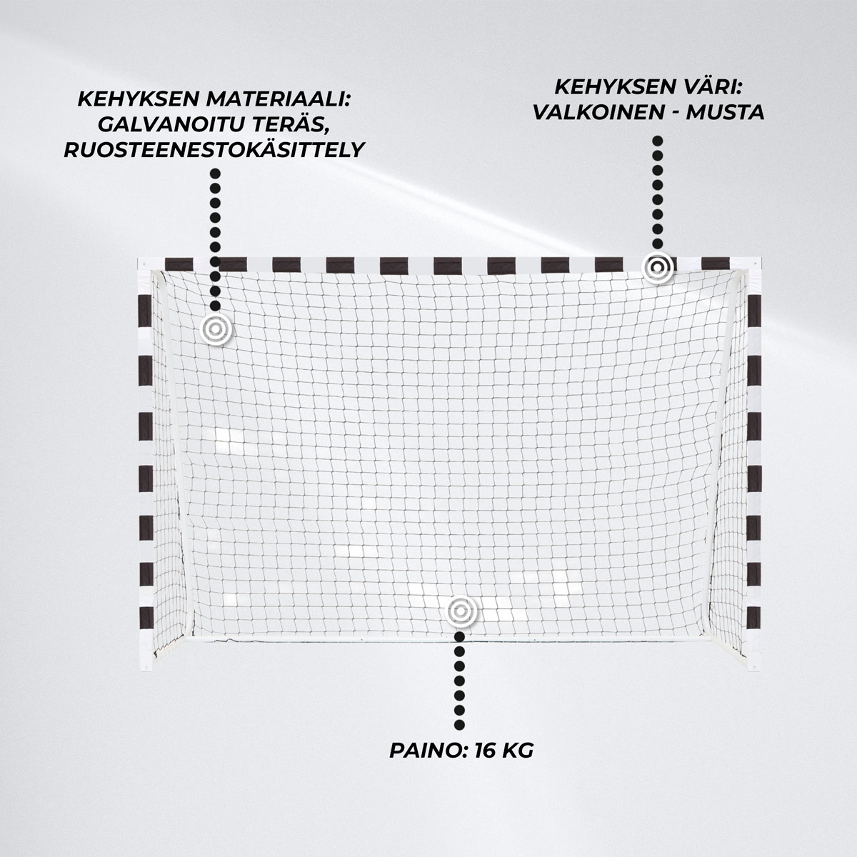 Viisi maahan kiinnitettävää ankkuria varmistavat, että maali pysyy paikoillaan myös kovemmissa peleissä – turvallisuus ennen kaikkea.