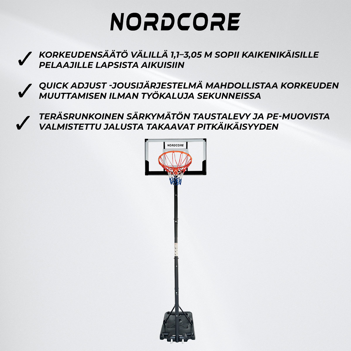 <p>Investoimalla laadukkaaseen <strong>koripallokoriin</strong>, voit nauttia pelistä ilman kompromisseja, parantaen pelitaitoja tehokkaasti ja turvallisesti.</p><h4>Miksi valita Nordcore Koripalloteline Finisher 1,1-3,05M?</h4>