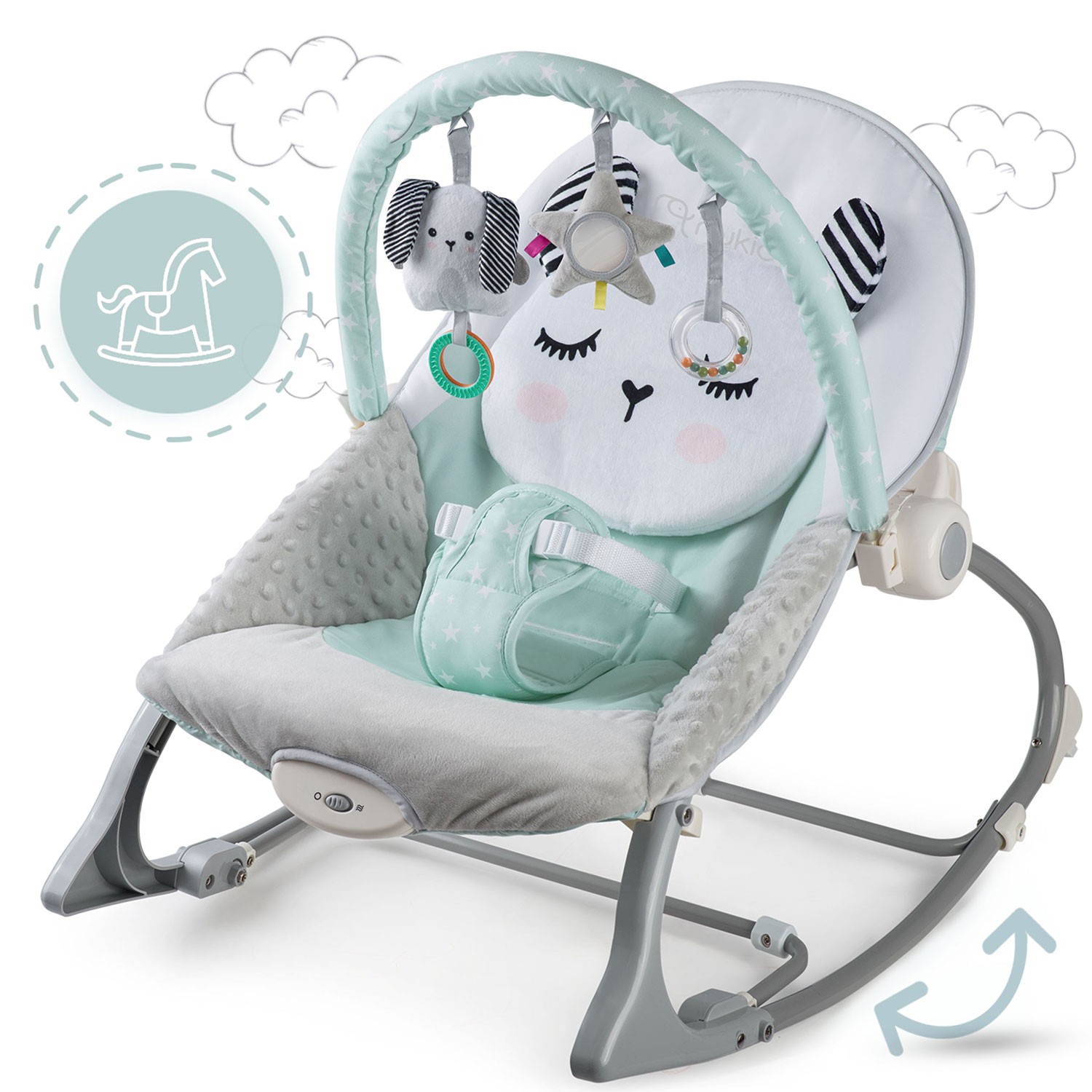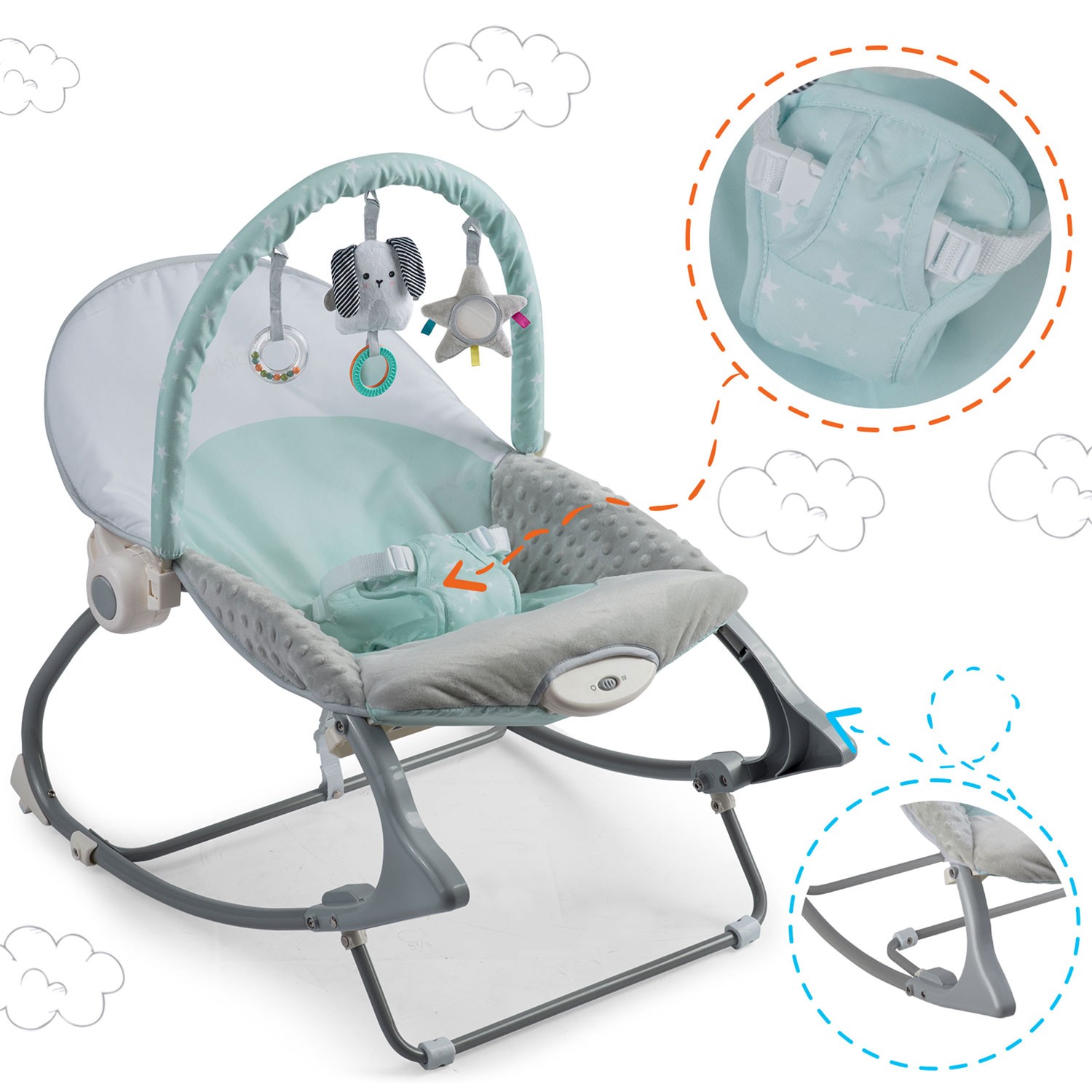 Sitterissä on irrotettava lelutanko, johon on kiinnitetty vinkuvia leluja. Ne viihdyttävät vauvaasi ja stimuloivat hänen näkö- ja tuntoaistiaan. Tarranauhalla kiinnitetyt eläimet voidaan helposti irrottaa ja järjestellä uudelleen tai korvata muilla pehmoleluilla.