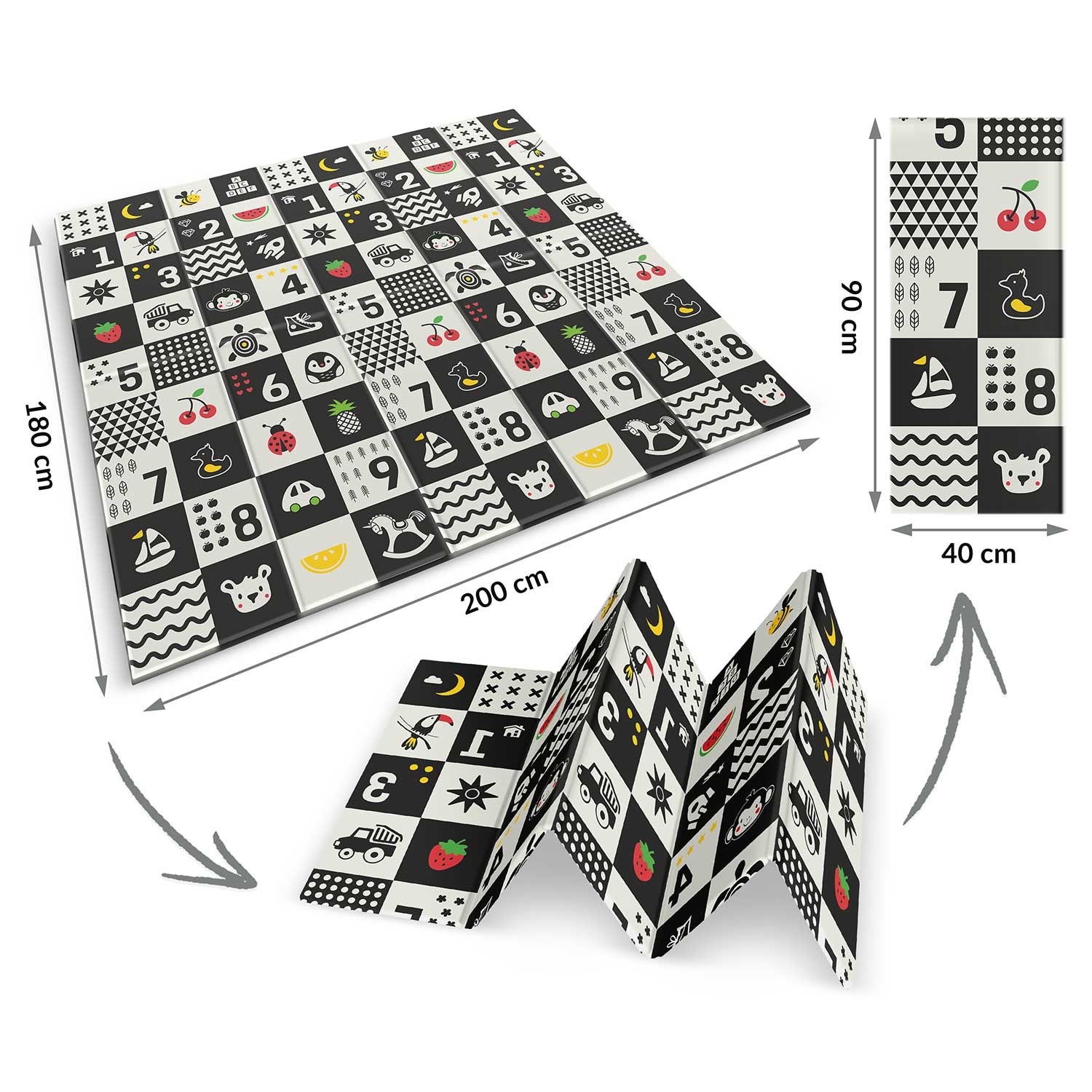 Tämä suuri taittuva matto, mitat 200 x 180 cm, tarjoaa lapsellesi monia käytännön sovelluksia ja mukavuutta leikkiin ja ryömimiseen.