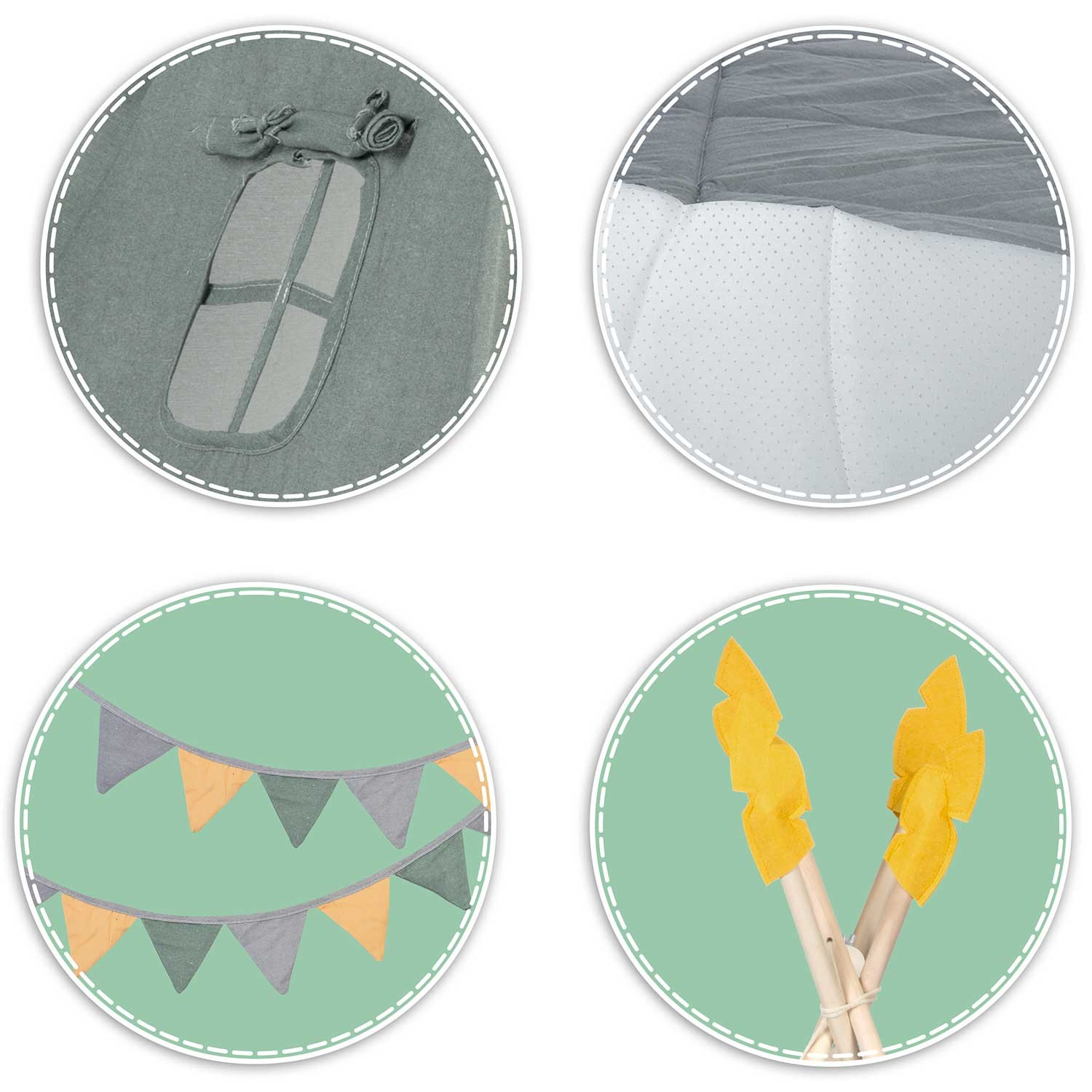 Teltta sisältää tyynyt ja erittäin paksun eristävän maton liukuesteillä. Matto tarjoaa mukavuutta ja kätevyyttä leikeissä ja voi toimia joko koriste-elementtinä tipiissä tai erillisenä mattona muissa huoneissa. Tyynyt (3 kpl), koristeelliset höyhenet ja tukijalka sisältyvät settiin ILMAISEKSI.