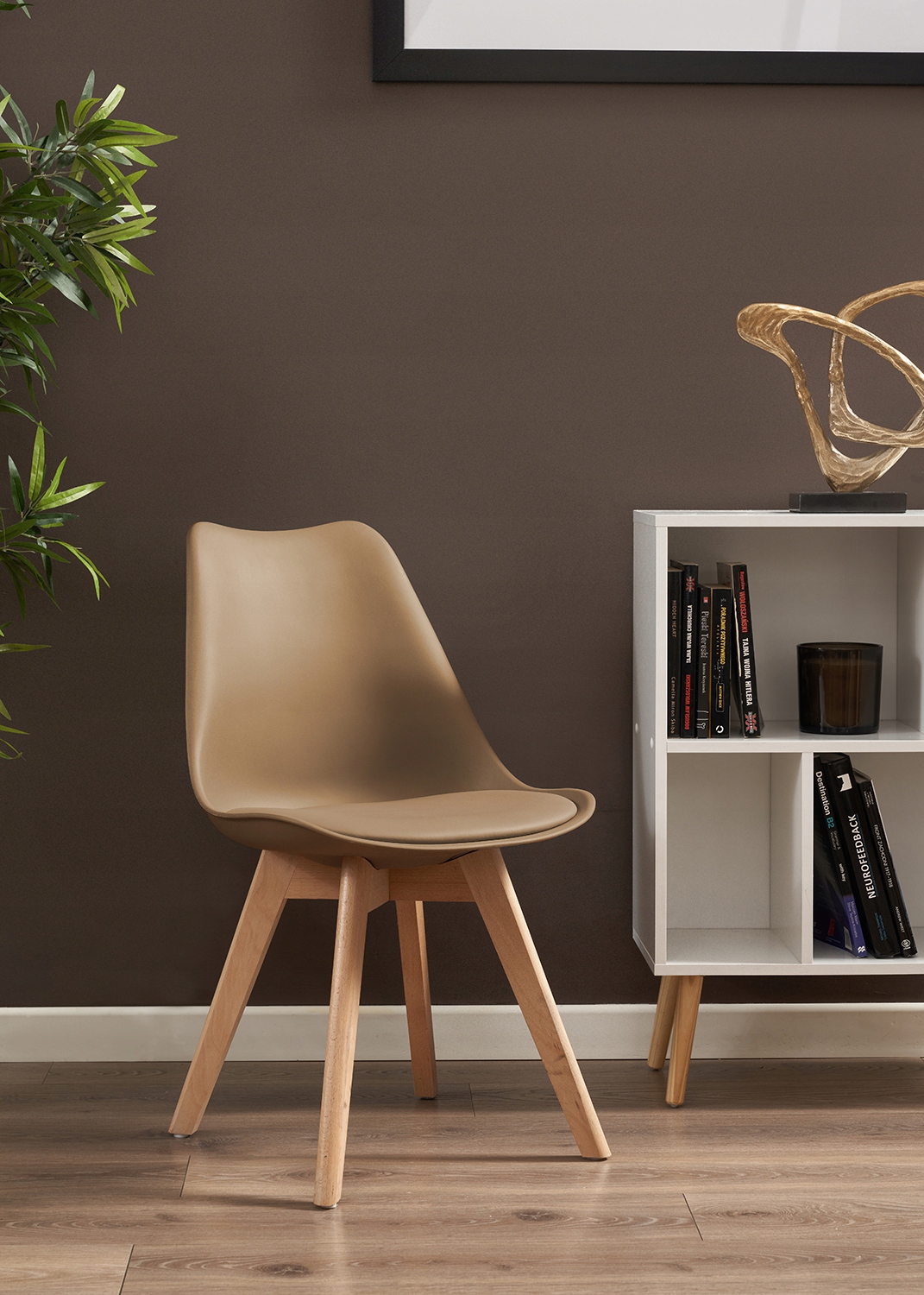 Siinä on täydellisesti muotoiltu selkänoja, joka yhdessä istuimelle asetetun pehmeän tyynyn kanssa takaa erinomaisen mukavuuden. Puiset jalat on valmistettu pyökistä, sen vaalea varjostin takaa vakauden ja kestävyyden. Tuoli on erittäin käytännöllinen ja toimiva.