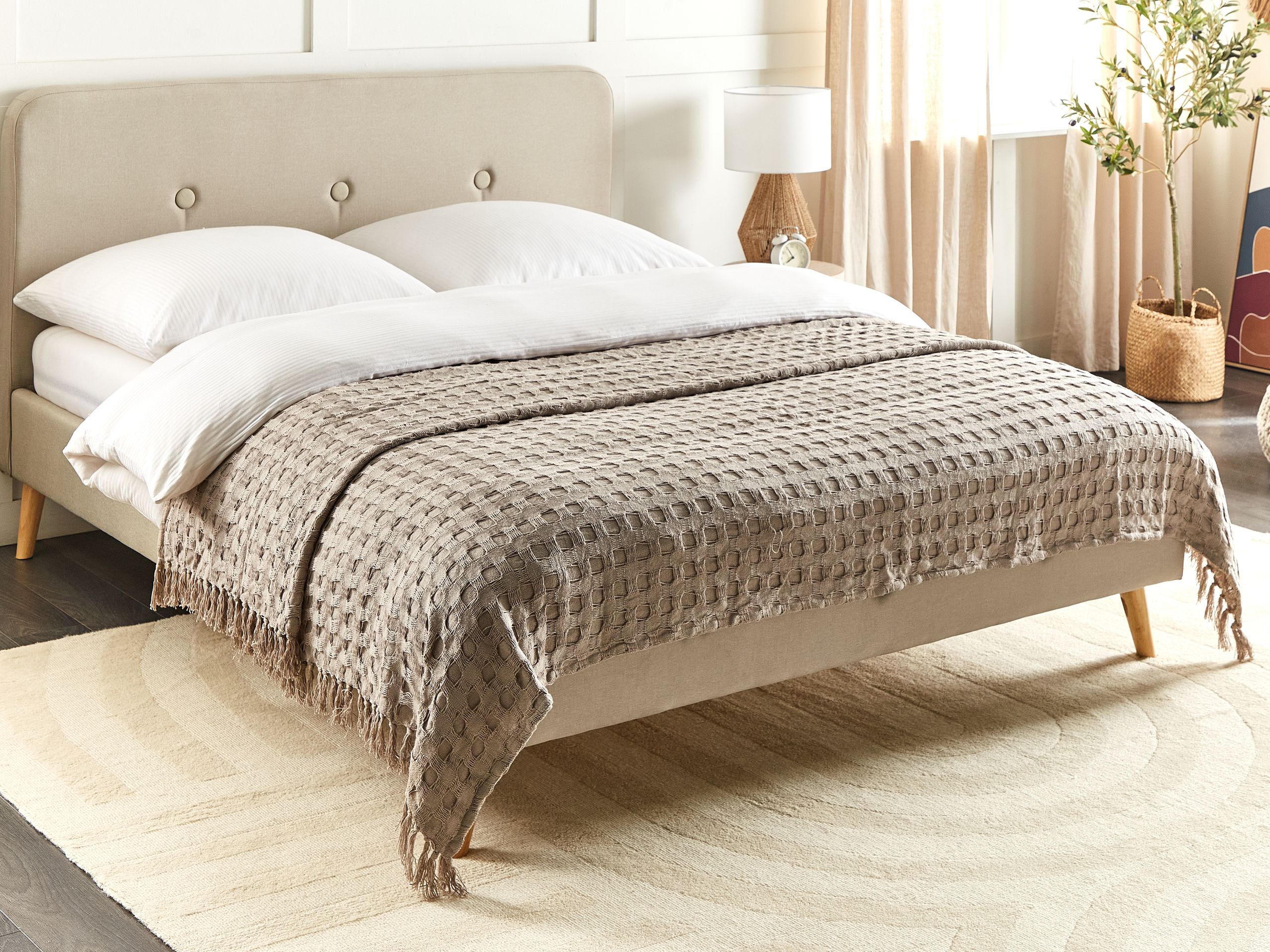 Tyylikäs päiväpeite hapsuilla. Nauti tämän päiväpeiton pehmeästä mukavuudesta, joka sopii monipuolisesti sekä mukavaksi peitoksi että tyylikkääksi sängynpeitteeksi. Pehmoisesta puuvillasta valmistettu ja viehättävillä hapsuilla koristeltu peite tuo ripauksen hienostuneisuutta jokaiseen makuuhuoneeseen. Helppohoitoinen ja konepestävä, se tarjoaa vaivatonta ylläpitoa laadusta tinkimättä.