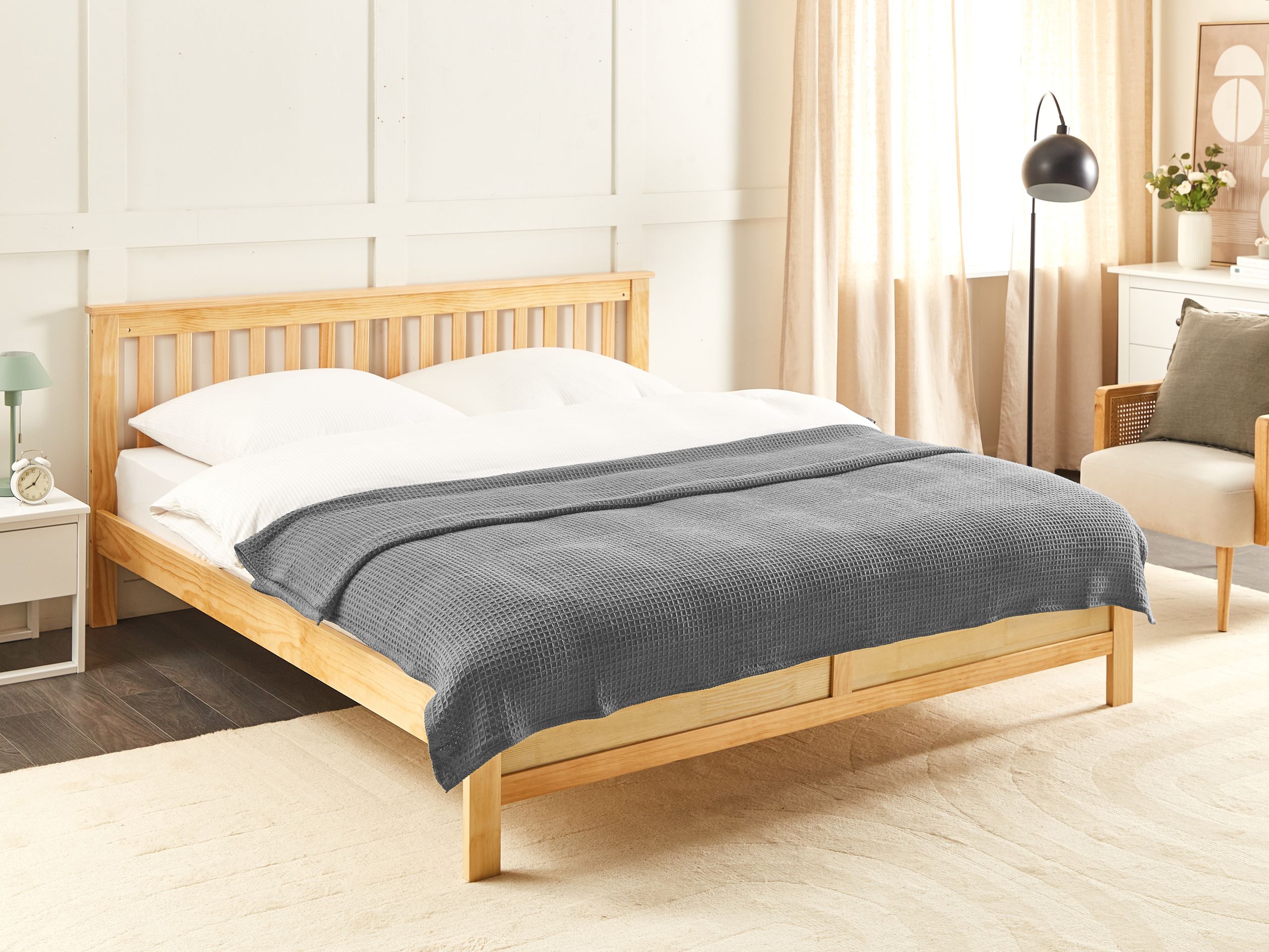 Sängyn vohvelipeite. Minimalistinen puuvillainen päiväpeitto tarjoaa äärimmäistä yksinkertaisuutta ja mukavuutta jokaiseen makuuhuoneeseen. Päiväpeitto on valmistettu korkealaatuisesta puuvillasta, joka on hengittävää ja pehmeää. Sen yksinkertainen vohvelikangas täydentää mitä tahansa sisustusta ja antaa rauhallisen ja selkeän tunteen tilaan kuin tilaan. Tämä puuvillainen päiväpeitto sopii erinomaisesti niille, jotka arvostavat hillittyä eleganssia.