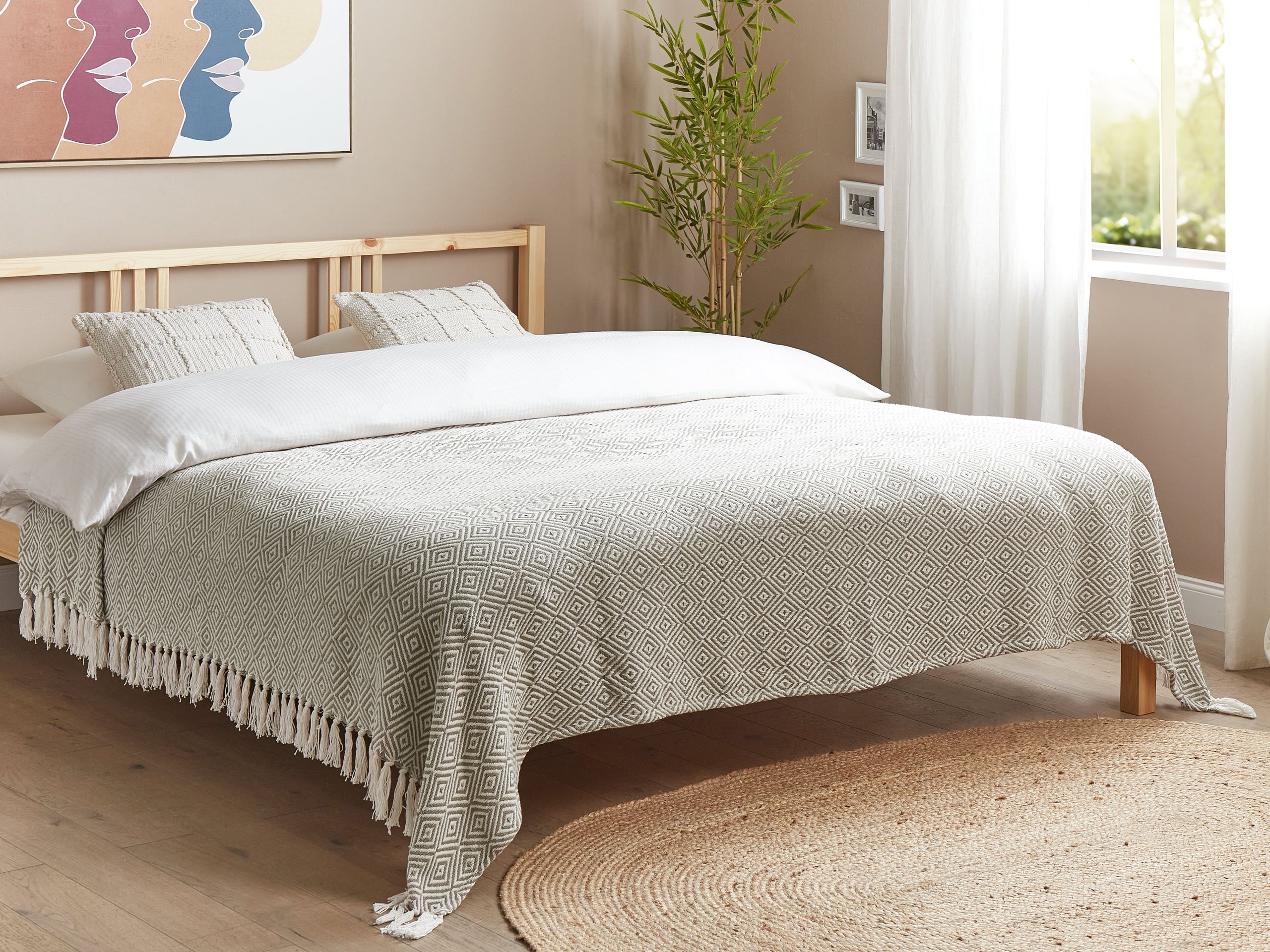 Torkkupeitto hapsuilla. Tässä pehmeässä päiväpeitossa on koristeellisia tupsuja, jotka tuovat ripauksen kodikkuutta olohuoneeseen tai makuuhuoneeseen. Lämmin väri sopii moneen sisustustyyliin ja tilaan. Tämä puuvillasta valmistettu torkkupeitto takaa kestävyyden, mukavuuden ja lämmön. Se sopii täydellisesti kotoiluun sohvan nurkassa viileinä iltoina.