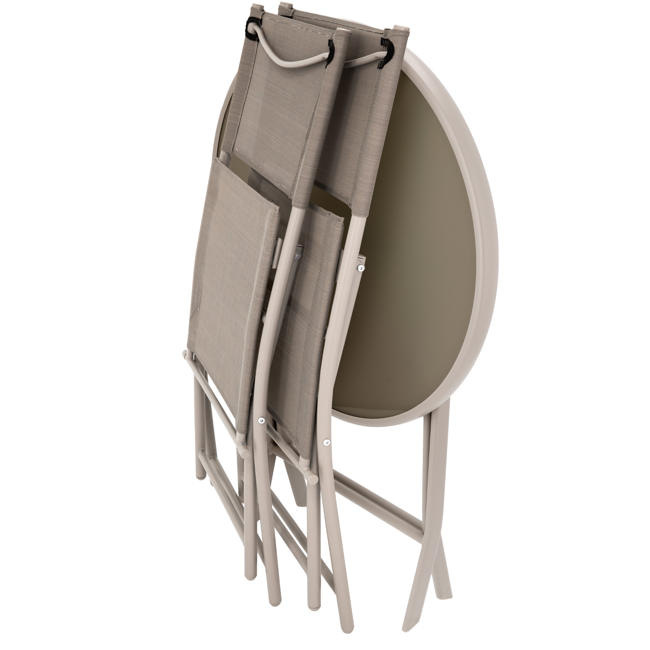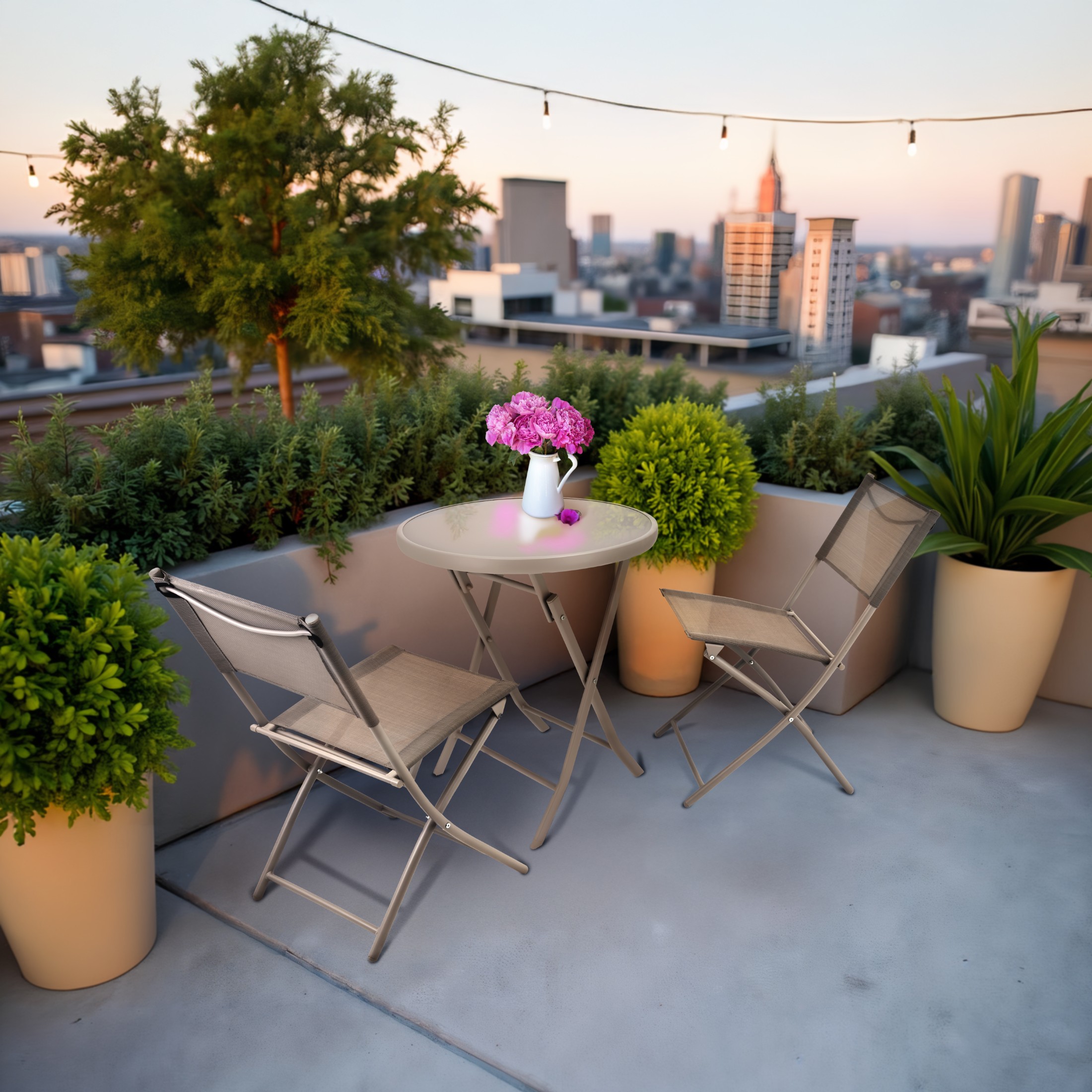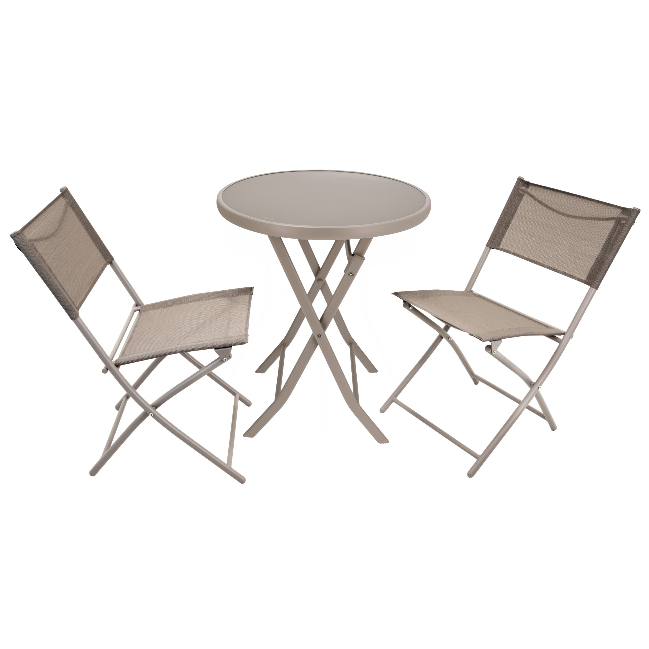 teräksestä, lasista ja kestävästä tekstiilikankaasta, jotka ovat kestäviä epäsuotuisille sääolosuhteille. Setti sisältää 2 taittotuolia ja pöydän