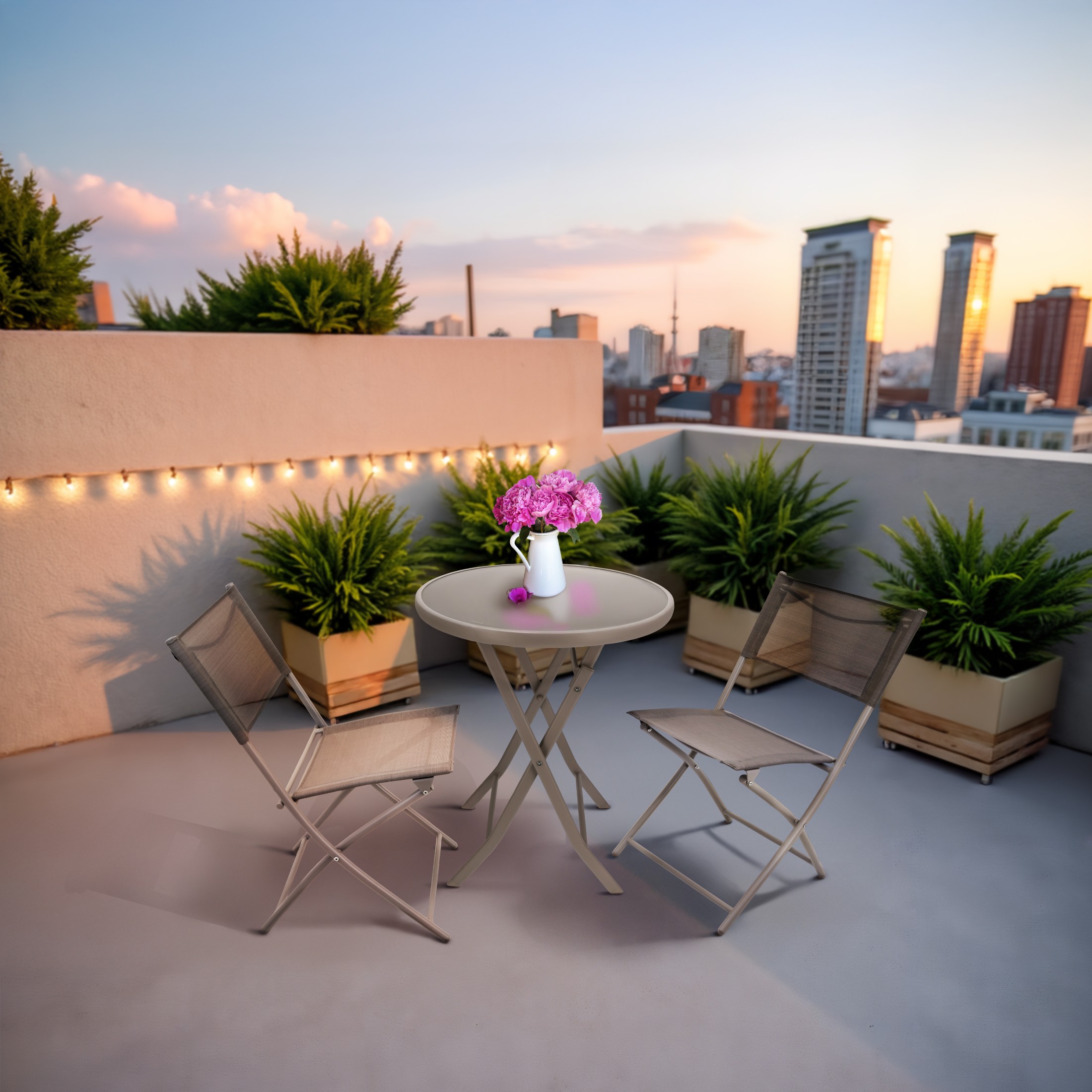 Puutarhakalustesetti, joka sopii hyvin pienelle parvekkeelle, terassille tai puutarhaan. Sarjan etuna on