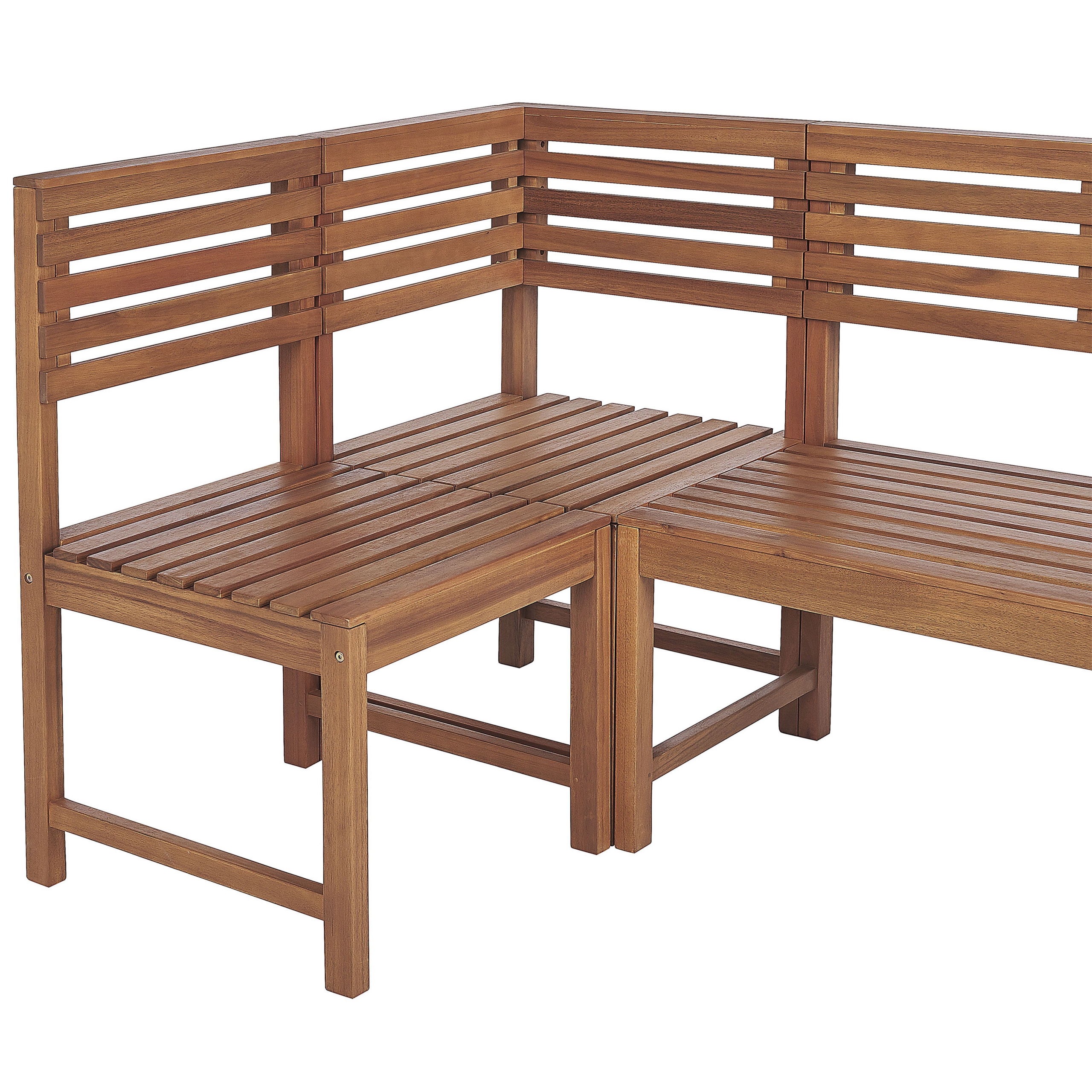 Kokoon taittuva pöytä ja kulmapenkki ulkokäyttöön. Etsitkö pientä parvekkeelle sopivaa kalustesettiä? Tämä rustiikkinen parvekekalustesetti on täydellinen vaihtoehto rajalliseen ulkotilaan. Kolme modulaarista osaa – penkki, kulmaosa ja puutarhatuoli voidaan järjestää sekä yhteen että erikseen. Mukana tuleva kokoontaitettava pöytä tekee kalusteryhmästä täydellisen paikan viettää aikaa yhdessä ystävien tai perheen kanssa. Kaikki kalusteet on valmistettu kestävästä ja pitkäikäisestä akaasiasta, jonka luonnollinen puunsävy saa setin sopimaan moniin erilaisiin sisustuksiin. Viimeistele penkit ulkotyynyillä ja ympäröi tila erilaisilla kasveilla.