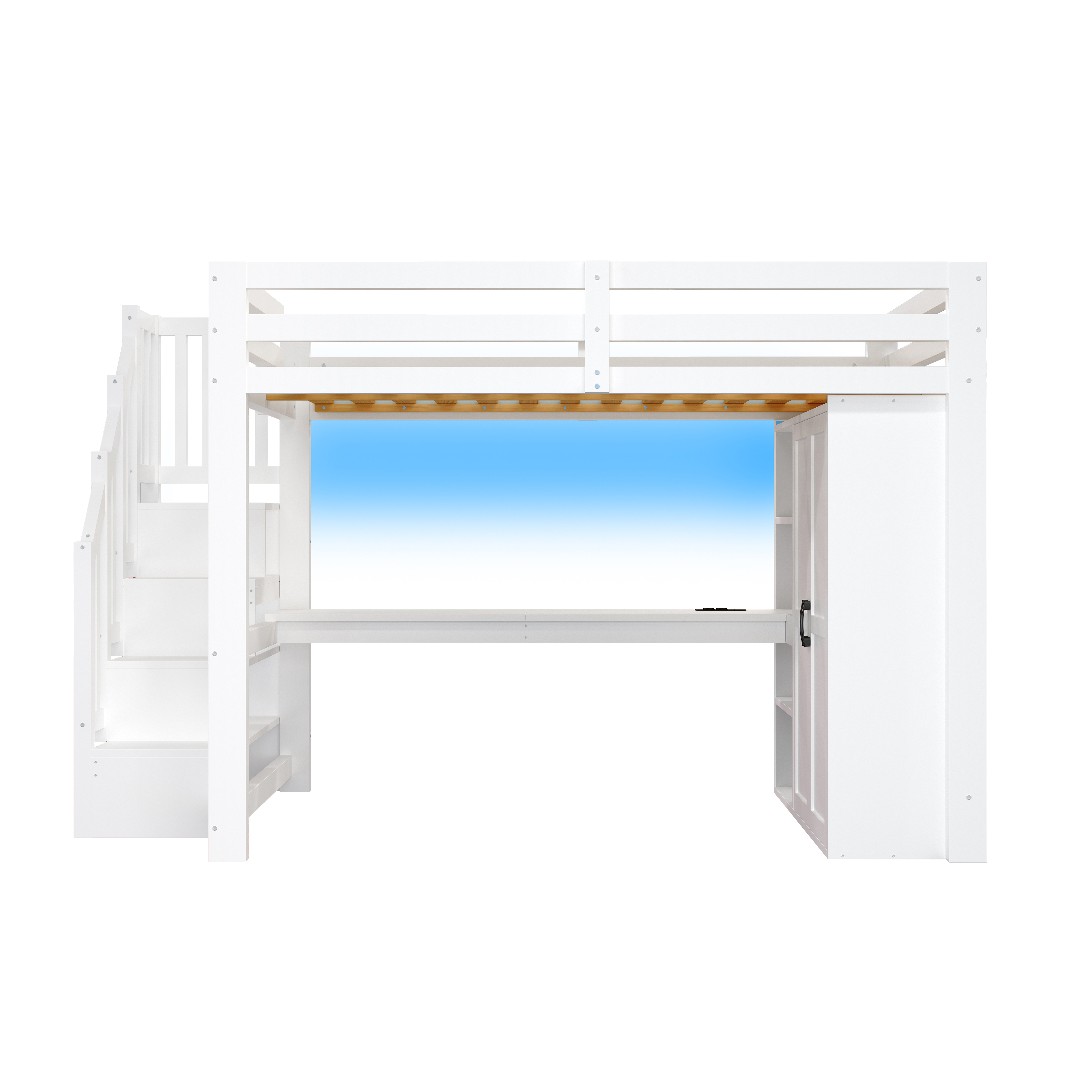 Parvisänky 140x200 cm, kaksinkertainen, työpöytä, vaatekaappi, portaat, USB, LED, valkoinen