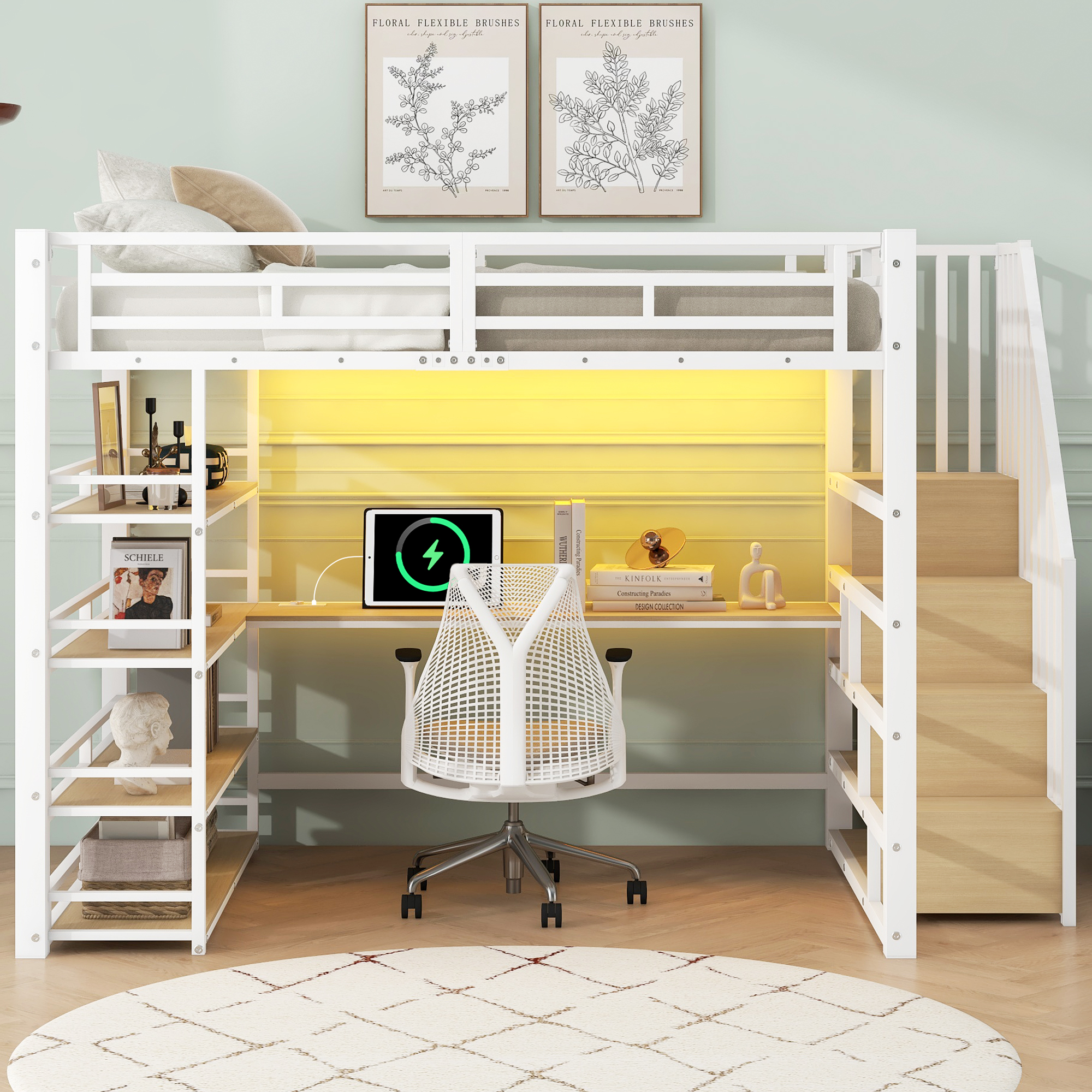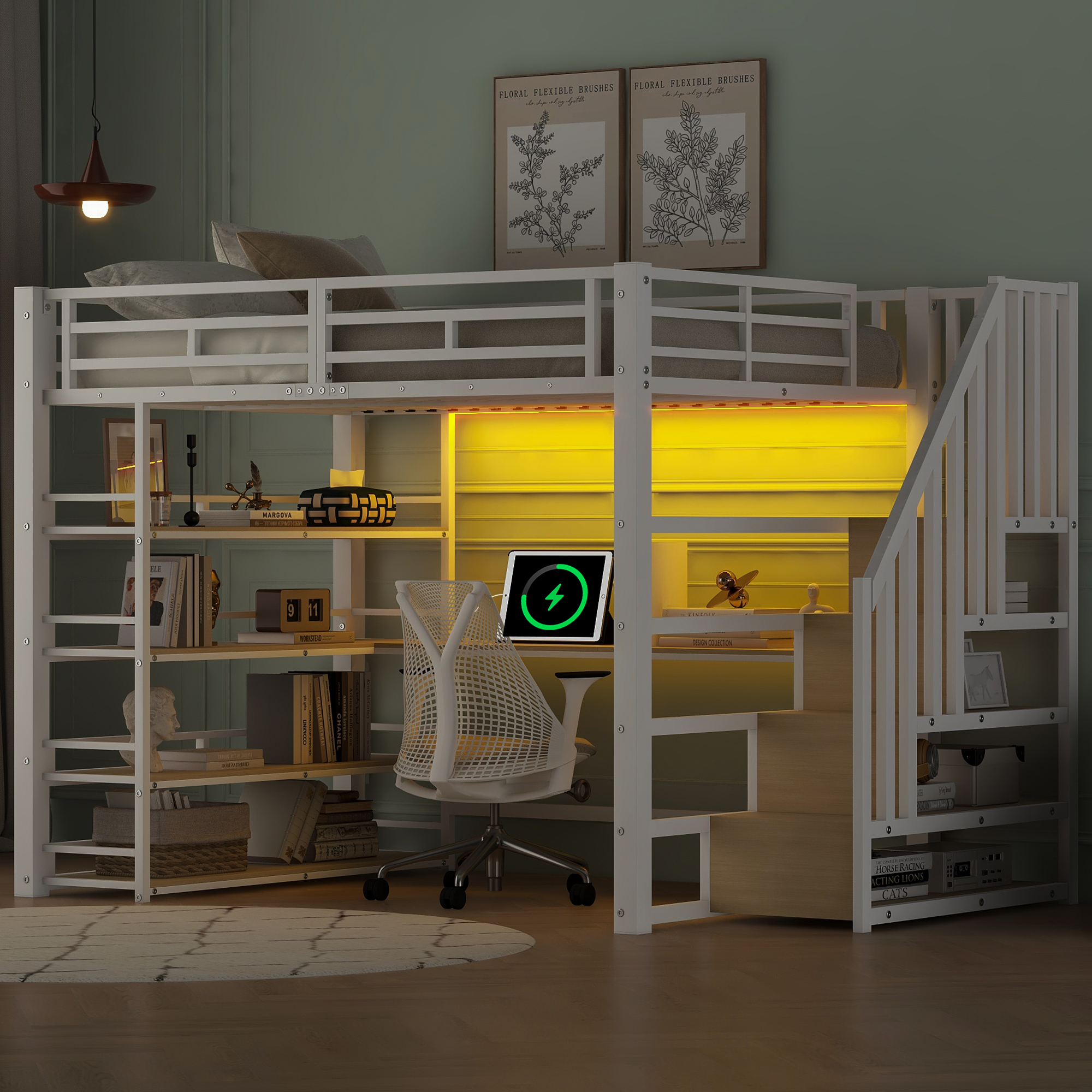 Parvisänky, 140x200 cm, metalli, työpöytä, hyllyt, USB, LED, valkoinen