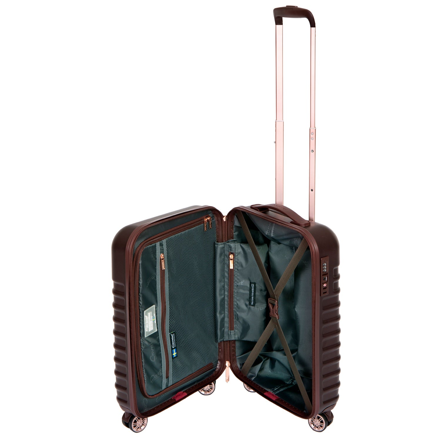 Ajateltuja yksityiskohtia, jotka sopivat yhteen. Kaksinkertaiset pyörät tekevät siitä vakaan ja helposti ohjattavan, sisäpuoli, joka seuraa laukun ulkoisia väriyhdistelmiä. Yksityiskohdat, kuten verkkotasku ja lokero pienille tavaroille, jakajat ja pakkaushihnat, joihin asetat vaatteet, jotka ovat tukevasti paikallaan.