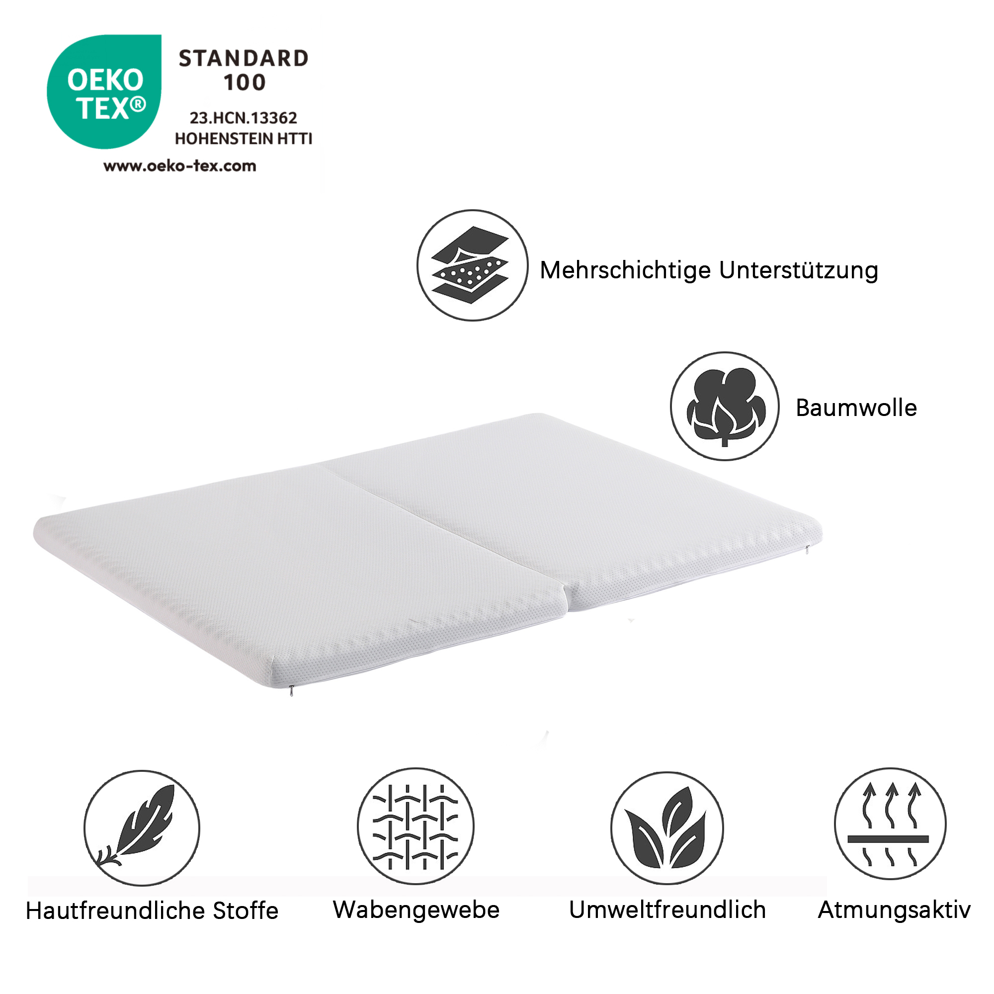 Kokoontaitettava patja, mukava, hunajakennomainen kangas, päällinen liukumattomilla hiukkasilla, Oeko-Tex H3 -sertifioitu.