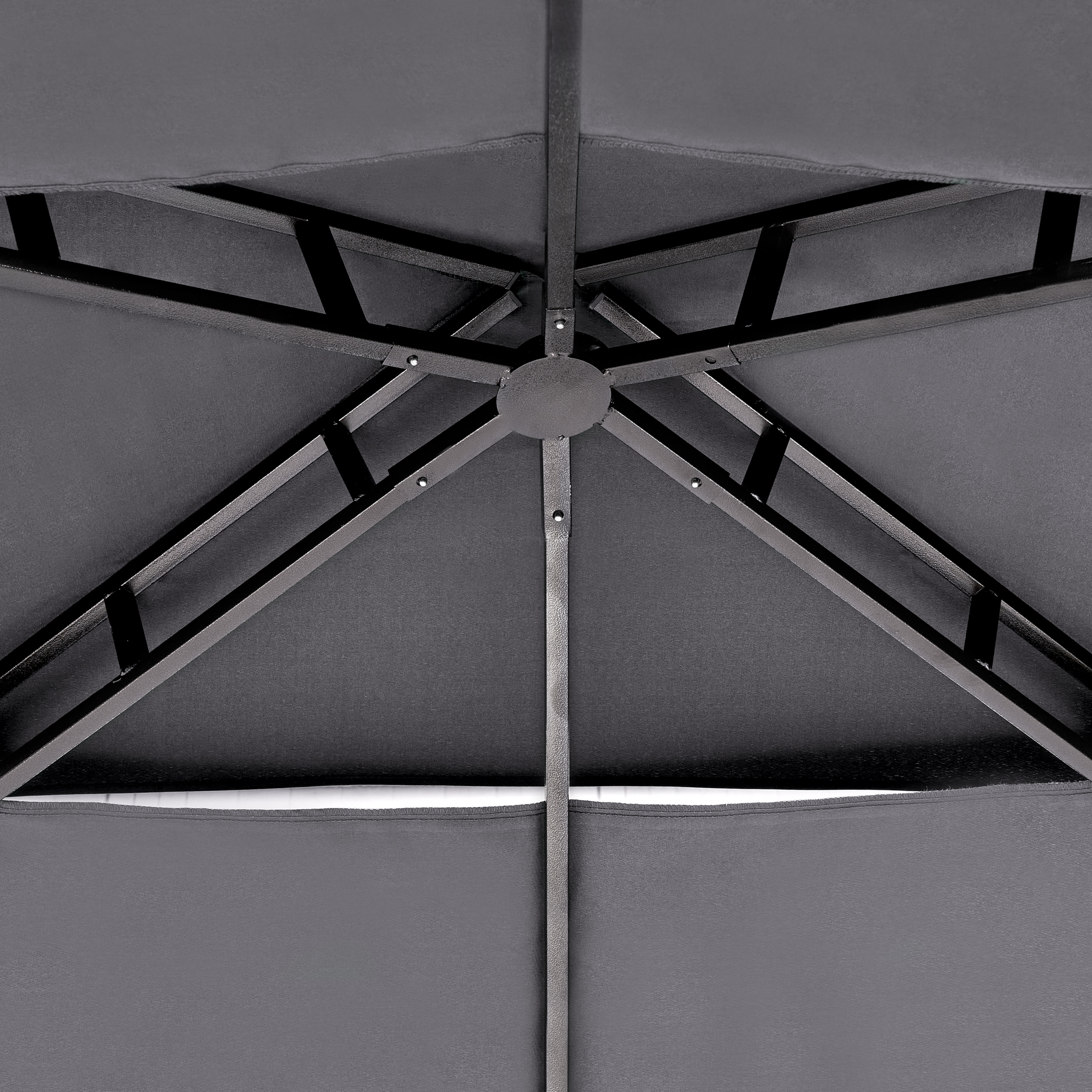Moderni puutarhakatos hyllyillä. Valmistele puutarhasi grillikauteen ja lämpimiin, perheen ja ystävien kanssa vietettäviin kesäiltoihin tällä paviljongilla. Sen alle mahtuu helposti pieni ruokailu- tai sohvaryhmä. Kestävästä, mustaksi jauhemaalatusta teräksestä valmistettu runko takaa vakauden. Harmaa, tuuletusaukoilla varustettu kangaskatos tarjoaa täydellisen suojan UV-säteiltä ja jatkuvan ilmankierron. Lisäksi mukana tulevat hyllyt ja ripustuskoukut mahdollistavat astioiden säilyttämisen tai kukkaruukkujen esille panon. Puutarhakatos sopii sekä moderneihin että perinteisiin ulkotiloihin, tuoden niihin tyyliä.