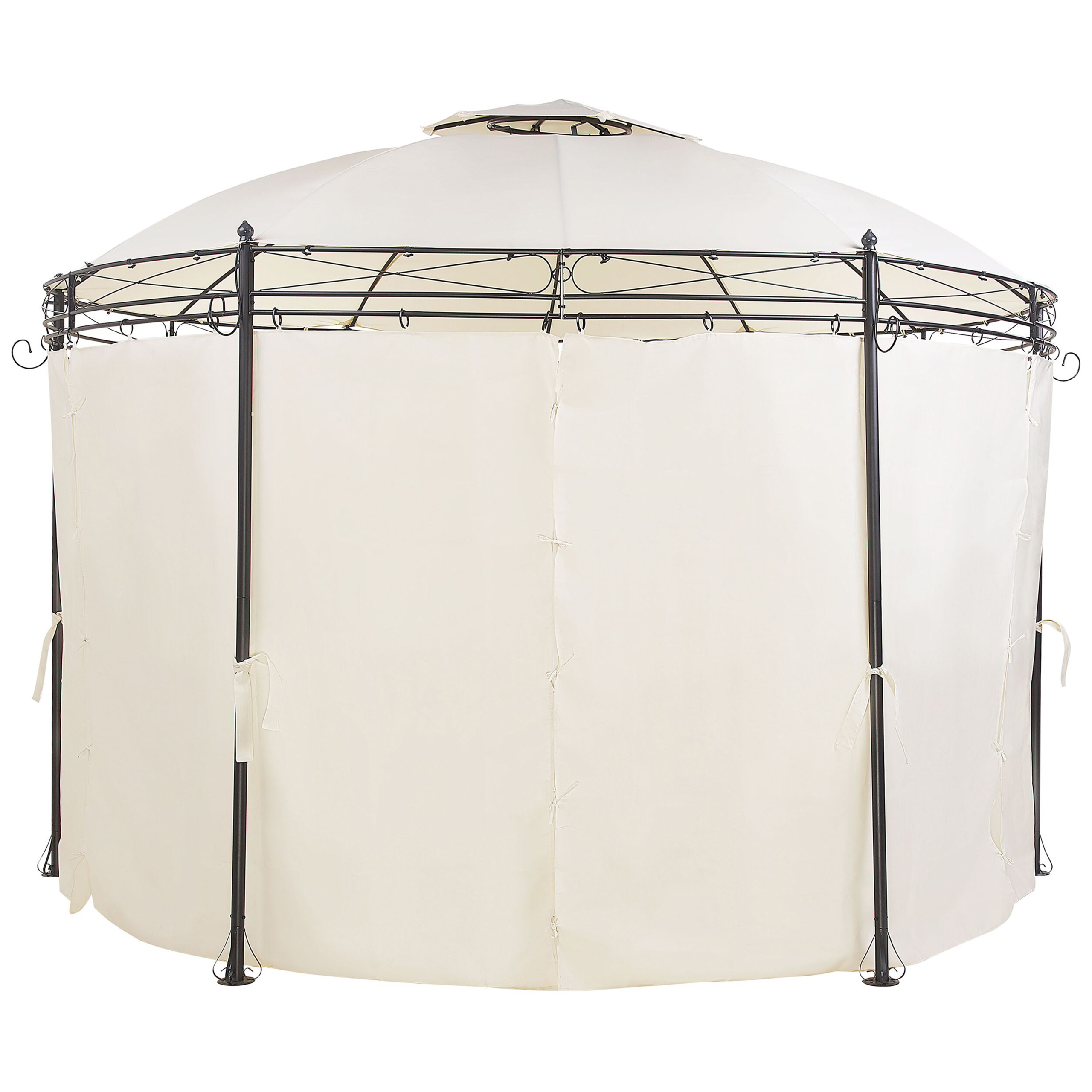 Elegantti pihakatos. Valmistaudu kesään ja kuumiin aurinkoisiin päiviin tällä tyylikkäällä puutarhakatoksella. Vankasta, mustaksi jauhemaalatusta teräksestä valmistettu runko on kestävä ja tukeva. Mukana tulevat beigestä polyesterikankaasta valmistetut verhot on varustettu vetoketjulla, joten ne on helppo sulkea illan viiletessä. Yläosassa sijaitsevat ilmanvaihtoaukot takaavat raikkaan ilman myös silloin, kun verhot ovat kiinni. Luo varjoisa ruokailutila tai mukava illanviettopaikka takapihallesi tämän tyylikkään katoksen avulla.