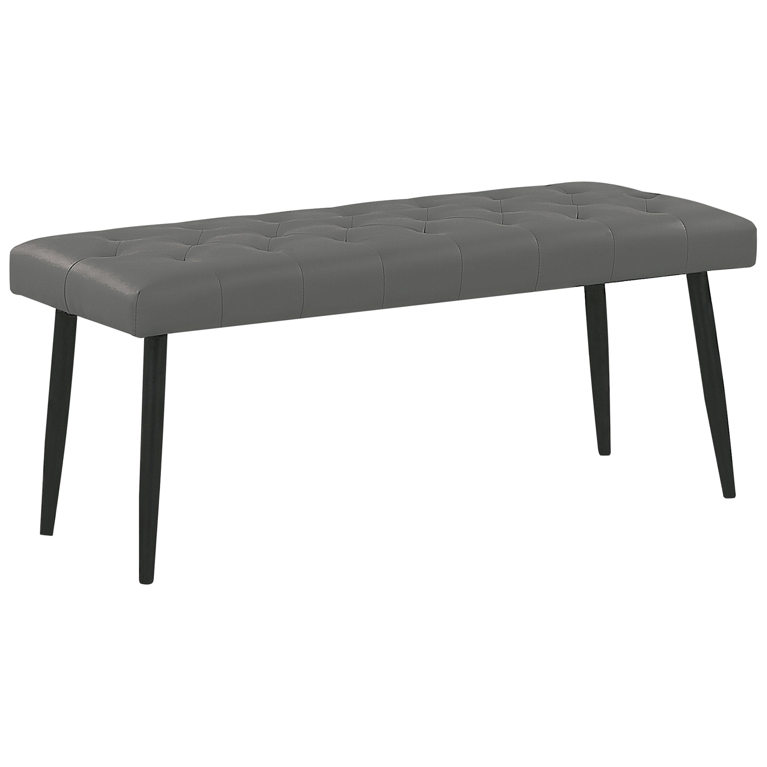 Moderni verhoiltu sängynpäätypenkki. Lisää modernia tyyliä makuuhuoneeseen tai olohuoneeseen tällä penkillä. Sen istuin on verhoiltu keinonahalla, mikä tekee penkistä erittäin kestävän ja vähän ylläpitoa vaativan. Mustat metallijalat täydentävät istuimen harmaata väriä ja takaavat vakauden. Koristeellinen tuftaus täydentää sen muuta muotoilua, tehden penkistä hienostuneen lisän jokaiseen sisustukseen. Penkkiä voi käyttää joko istuimena tai sen päälle voi asettaa vaikkapa päiväpeiton ja muita tarpeellisia esineitä.