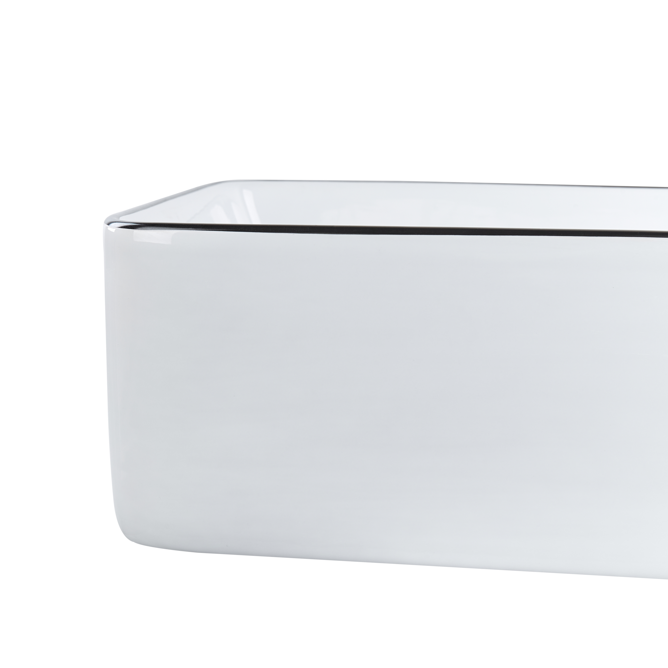 Perinteinen suorakulmainen kylpyhuoneen allas. Kohota kylpyhuoneesi ilmettä tällä elegantilla pesualtaalla, joka yhdistää klassista ja minimalistista tyyliä. Kiiltävä valkoinen viimeistely saa hienostuneen lisän mustasta reunasta. Klassisen värimaailmansa ansiosta pesuallas on ajaton valinta mihin tahansa sisustukseen, olipa se sitten moderni tai perinteinen. Allas on valmistettu korkealaatuisesta keramiikasta, minkä ansiosta se on sekä käytännöllinen että tyylikäs valinta jokaiseen kylpyhuoneeseen.