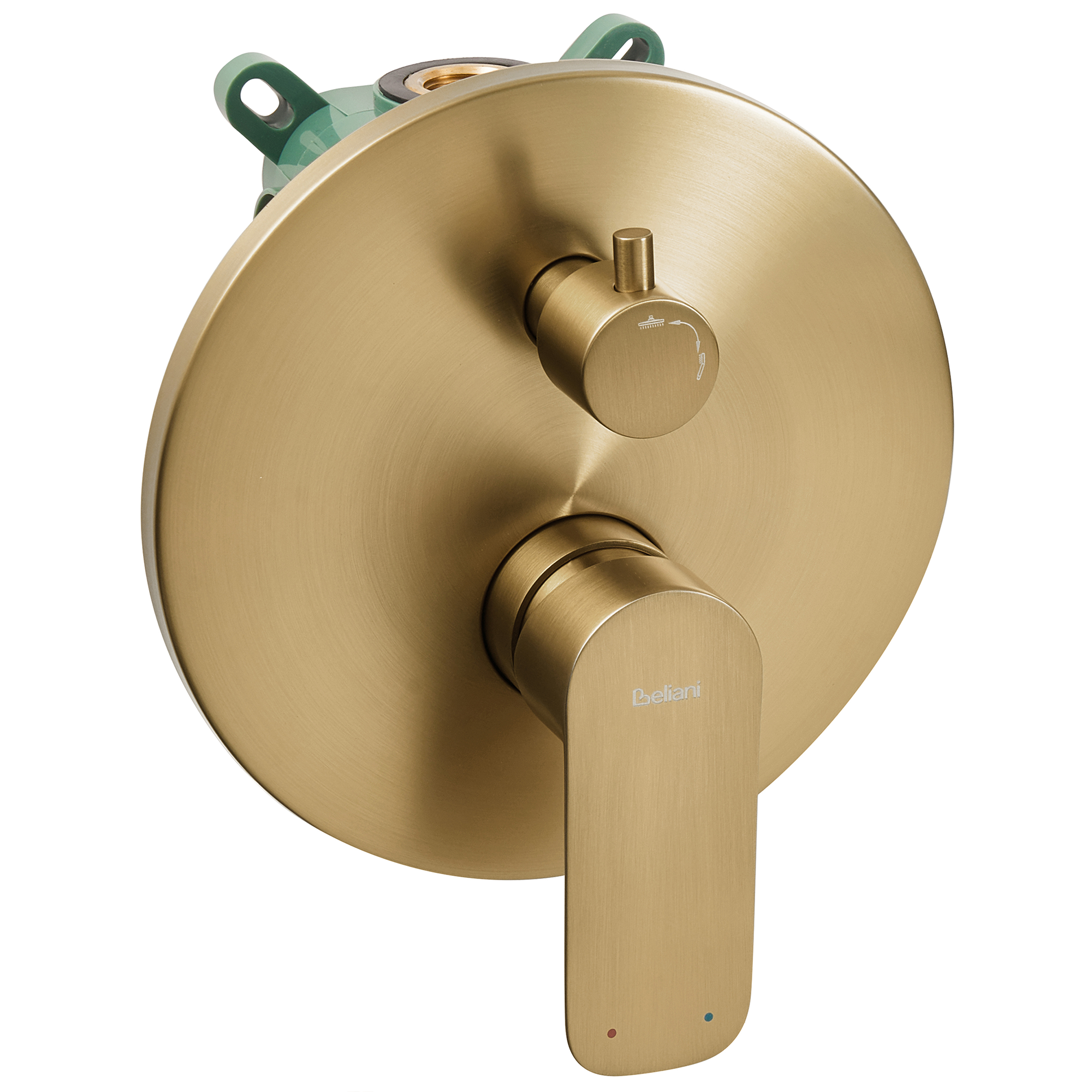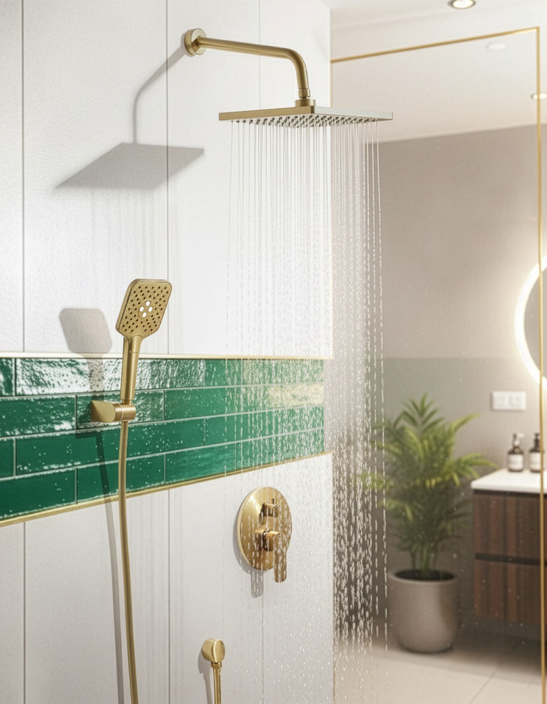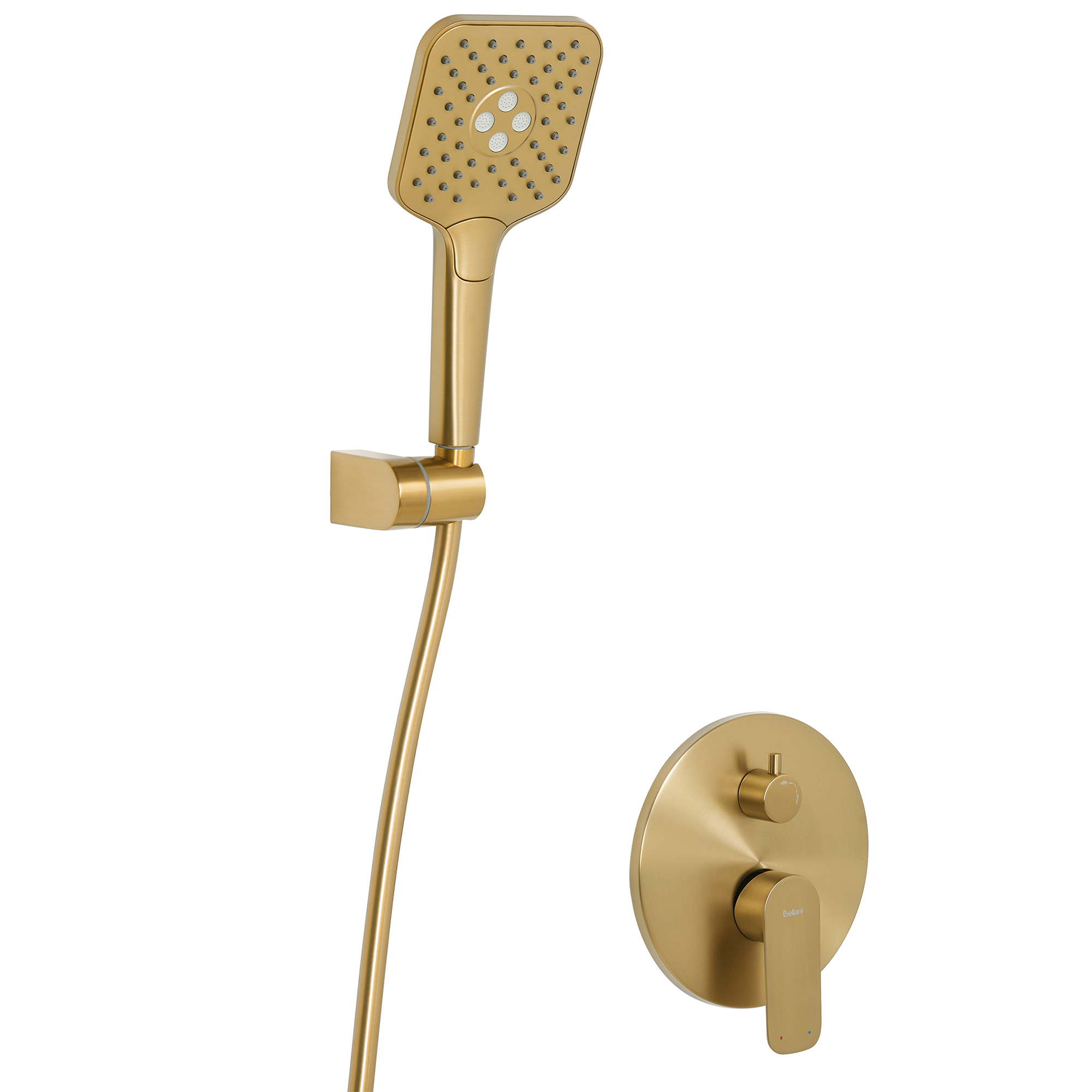 Piiloasennettu sadesuihkusetti seinään. Luo kylpyhuoneeseen selkeä mutta minimalistinen ilme tällä piiloasennettavalla sadesuihkusetillä. Kestävästä messingistä valmistettu setti on tehty kestämään ja säilyttämään elegantin ulkonäkönsä vuosia. Kaikki putkistot asennetaan piiloon katseilta, mikä varmistaa puhtaan muotoilun, joka sopii jokaiseen nykyaikaiseen kylpyhuoneeseen. Sisäänrakennetut säätimet helpottavat lämpötilan ja virtauksen säätelyä sekä sade- ja käsisuihkun välistä vaihtoa. Siinä on myös kolme suihkutoimintoa – hierova, voimakas ja sade – jotka parantavat suihkukokemusta. Suihkusetti yhdistää vaivattoman käytön ja hienostuneen, modernin tyylin.