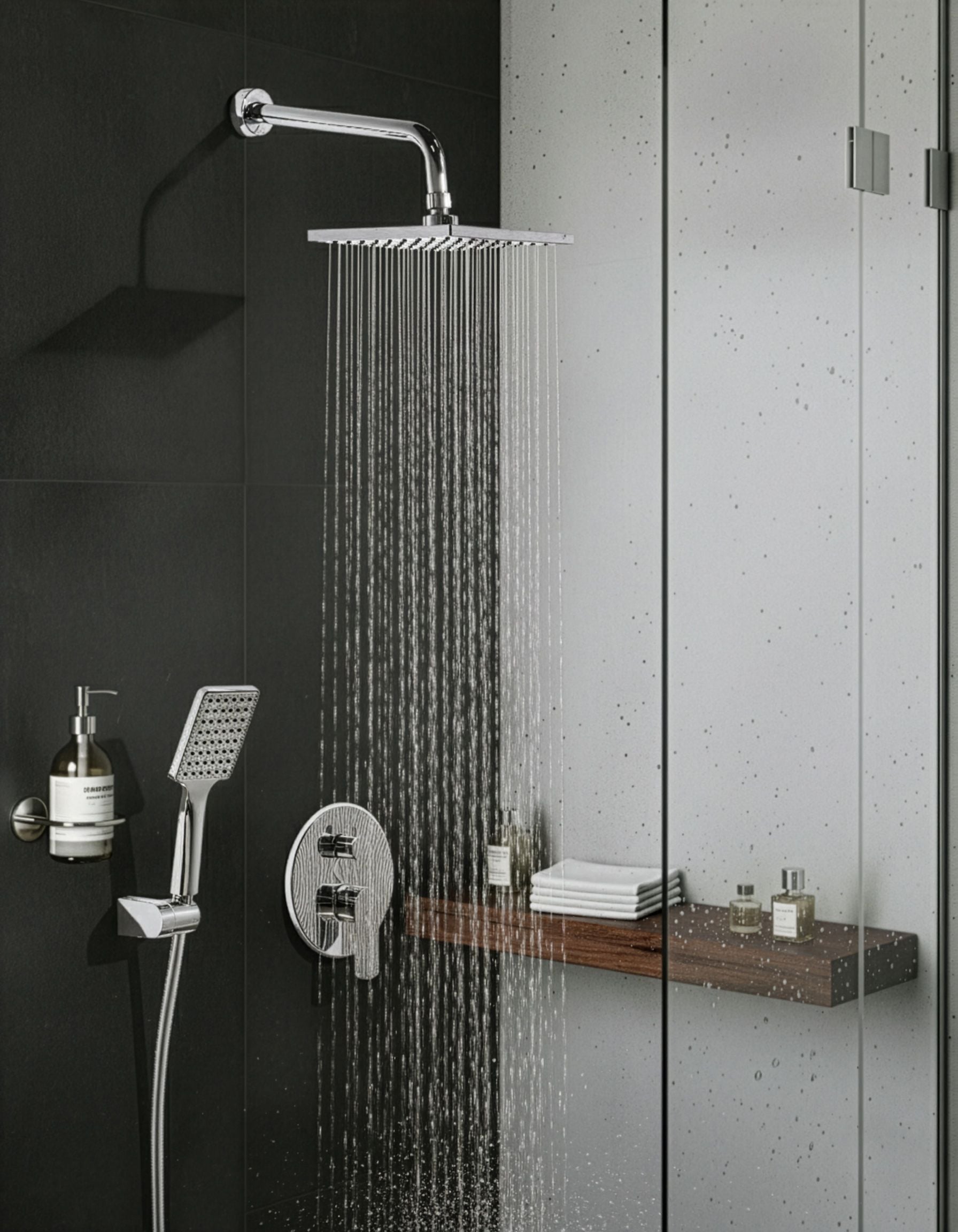 Piiloasennettu sadesuihkusetti seinään. Luo kylpyhuoneeseen selkeä mutta minimalistinen ilme tällä piiloasennettavalla sadesuihkusetillä. Kestävästä messingistä valmistettu setti on tehty kestämään ja säilyttämään elegantin ulkonäkönsä vuosia. Kaikki putkistot asennetaan piiloon katseilta, mikä varmistaa puhtaan muotoilun, joka sopii jokaiseen nykyaikaiseen kylpyhuoneeseen. Sisäänrakennetut säätimet helpottavat lämpötilan ja virtauksen säätelyä sekä sade- ja käsisuihkun välistä vaihtoa. Siinä on myös kolme suihkutoimintoa – hierova, voimakas ja sade – jotka parantavat suihkukokemusta. Suihkusetti yhdistää vaivattoman käytön ja hienostuneen, modernin tyylin.