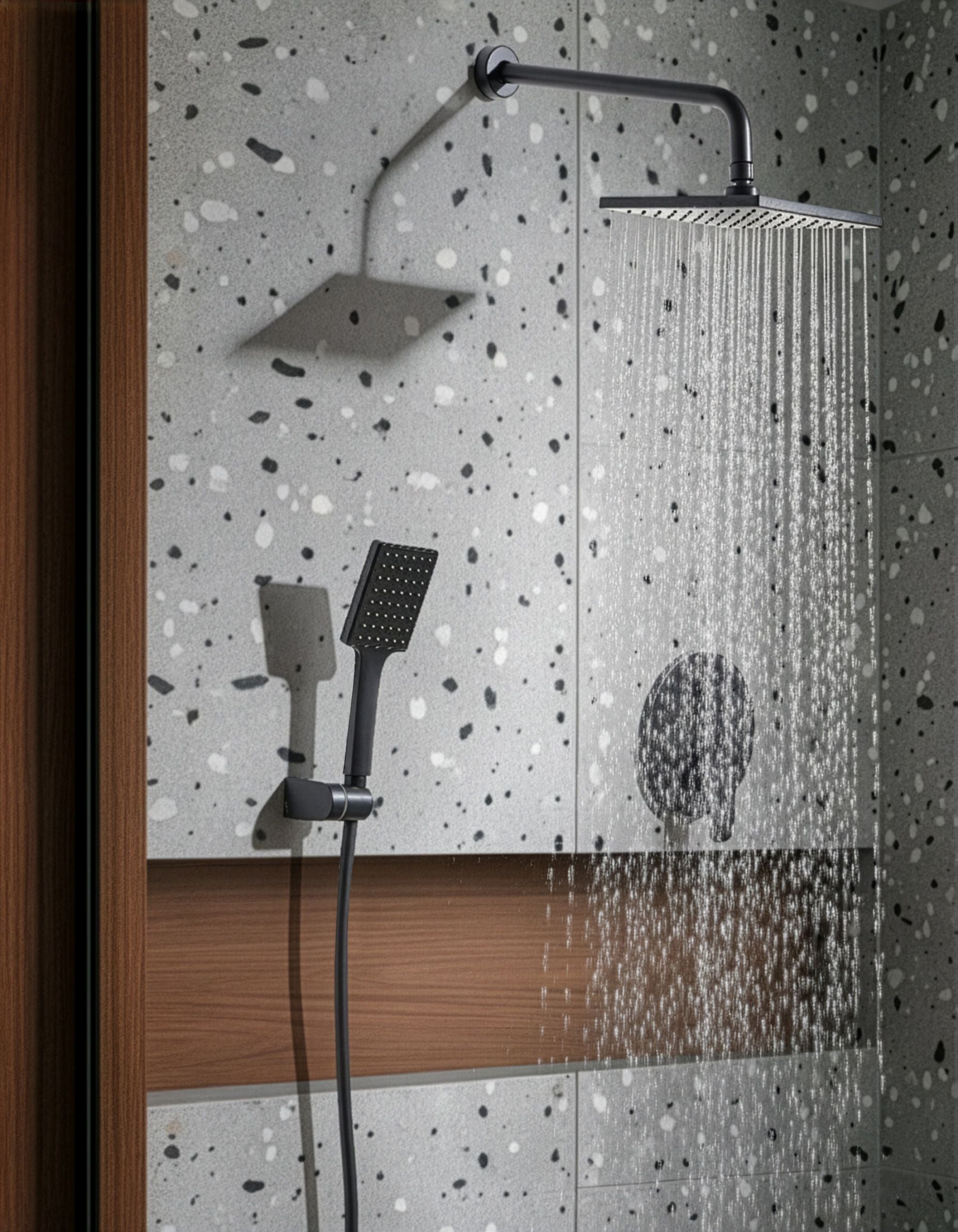 Piiloasennettu sadesuihkusetti seinään. Luo kylpyhuoneeseen selkeä mutta minimalistinen ilme tällä piiloasennettavalla sadesuihkusetillä. Kestävästä messingistä valmistettu setti on tehty kestämään ja säilyttämään elegantin ulkonäkönsä vuosia. Kaikki putkistot asennetaan piiloon katseilta, mikä varmistaa puhtaan muotoilun, joka sopii jokaiseen nykyaikaiseen kylpyhuoneeseen. Sisäänrakennetut säätimet helpottavat lämpötilan ja virtauksen säätelyä sekä sade- ja käsisuihkun välistä vaihtoa. Siinä on myös kolme suihkutoimintoa – hierova, voimakas ja sade – jotka parantavat suihkukokemusta. Suihkusetti yhdistää vaivattoman käytön ja hienostuneen, modernin tyylin.