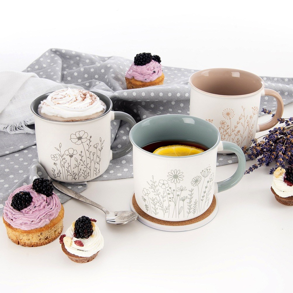 Valmistettu posliinista - Valmistettu korkealaatuisesta valkoisesta posliinista. Mukin sisäosa ja kahva ovat harmaat. Mukissa on villikukka-aihe. Oikein käytettynä se kestää useita vuosia.