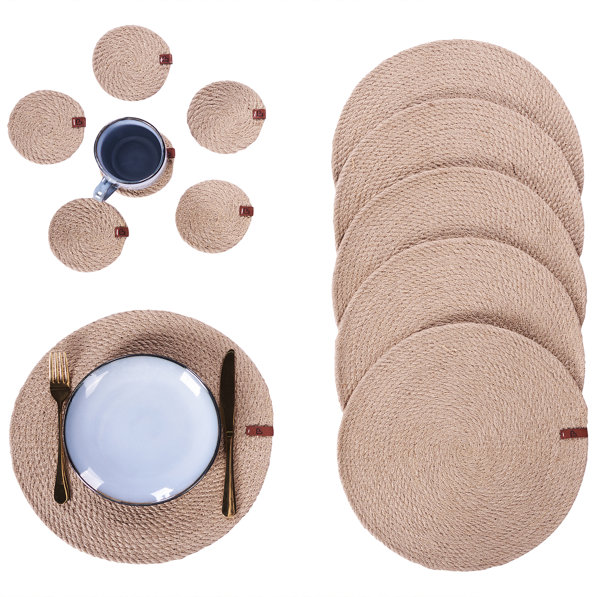 Pyöreät käsintehdyt pöytätabletit ja lasinaluset. Tuo ruokapöydälle uutta ilmettä tällä ihastuttavalla käsintehtyjen lasinalusten ja pöytätablettien setillä, joka on valmistettu kestävästä ja ympäristöystävällisestä juutista. Luonnollisen boho-muotoilun ansiosta ne lisäävät lämpöä ja tekstuuria jokaiseen kattaukseen. Tabletit ja lasinaluset suojaavat pintoja ja tarjoavat täydellisen yhdistelmän tyyliä ja pitkäikäisyyttä, sopien erinomaisesti sekä arkeen että juhlaan. Lisää kotiisi rustiikkista eleganssia ja ihastu kestävään, käsityönä valmistettuun muotoiluun.