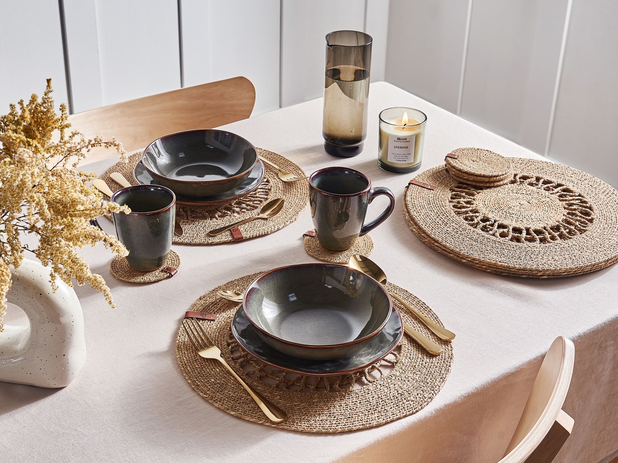 Pöytätabletti- ja lasinalussetti 6+6 PEPPERBERRY Luonnonväri Meriruoho