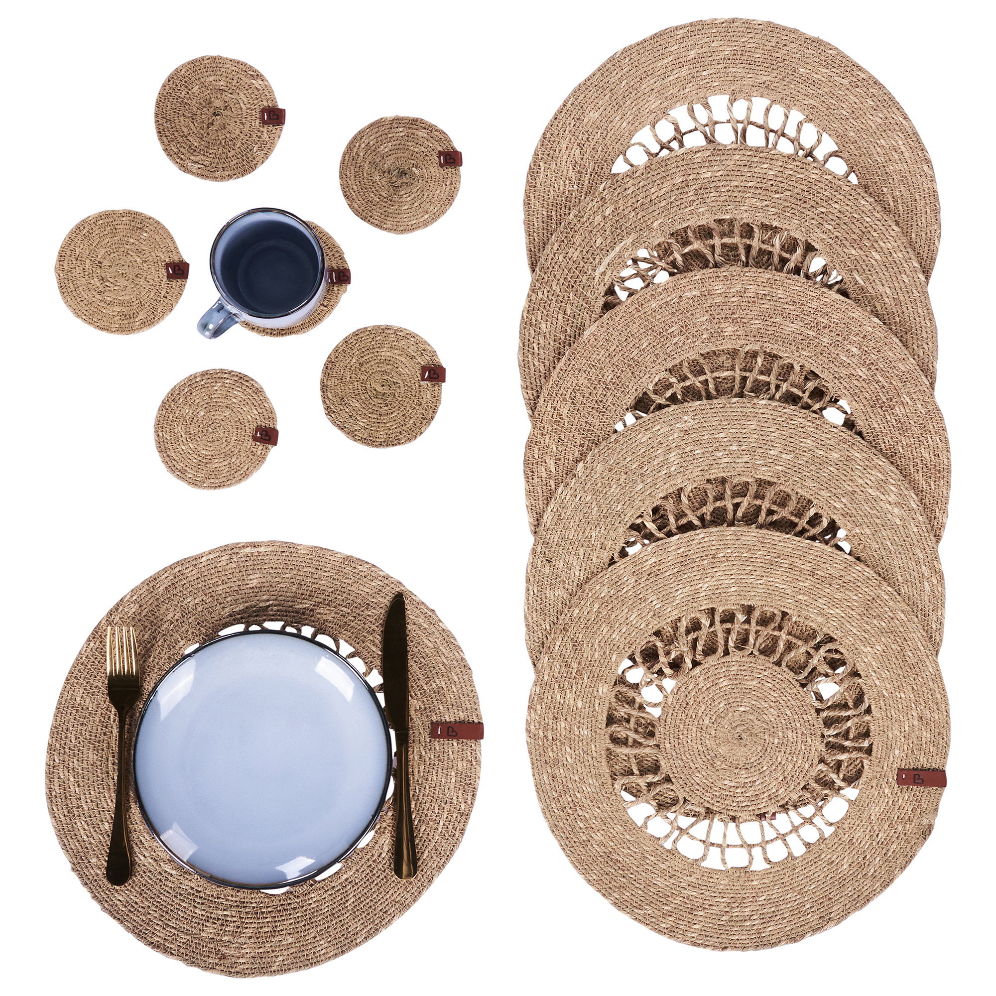 Pyöreät käsintehdyt lasinaluset ja pöytätabletit. Tuo rustiikkista tunnelmaa kattaukseesi tällä tyylikkäällä käsintehtyjen pöytätablettien ja lasinalusten setillä. Luonnollisesta meriruohosta punotut tabletit ja lasinaluset lisäävät ripauksen boho-viehätystä mihin tahansa sisustukseen. Ainutlaatuinen kuvio ja luonnonsävy tekevät niistä täydellisen lisän jokaiseen kotiin.