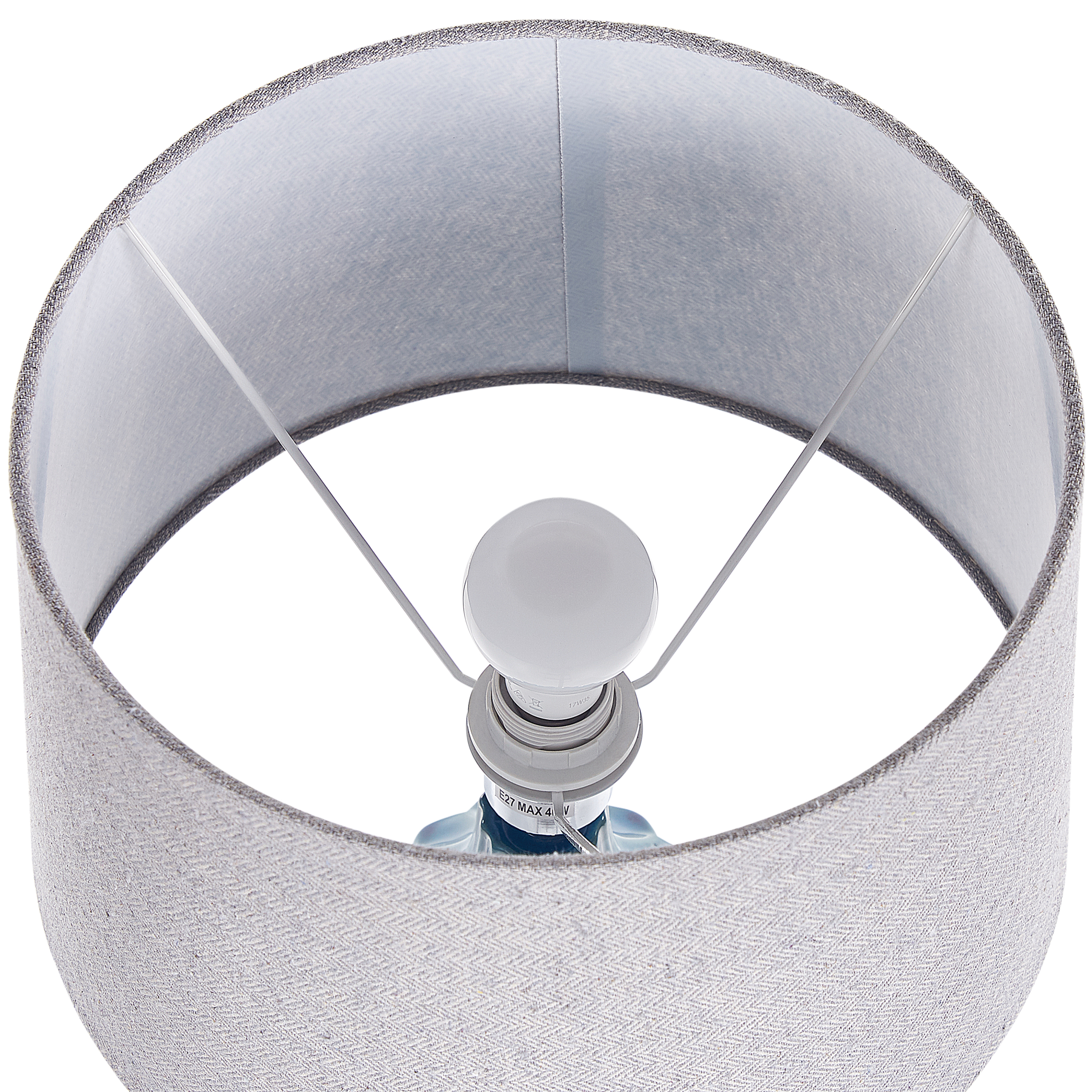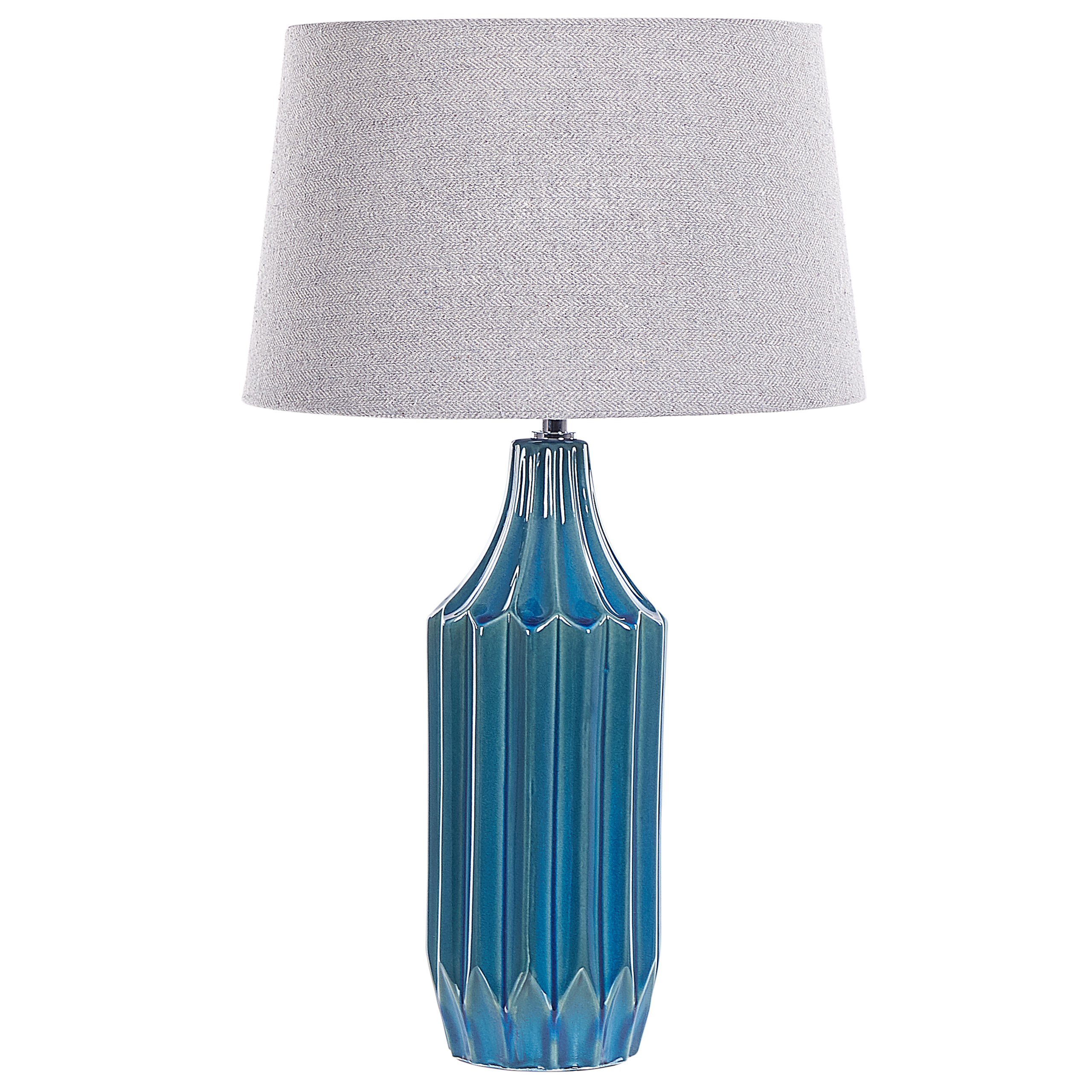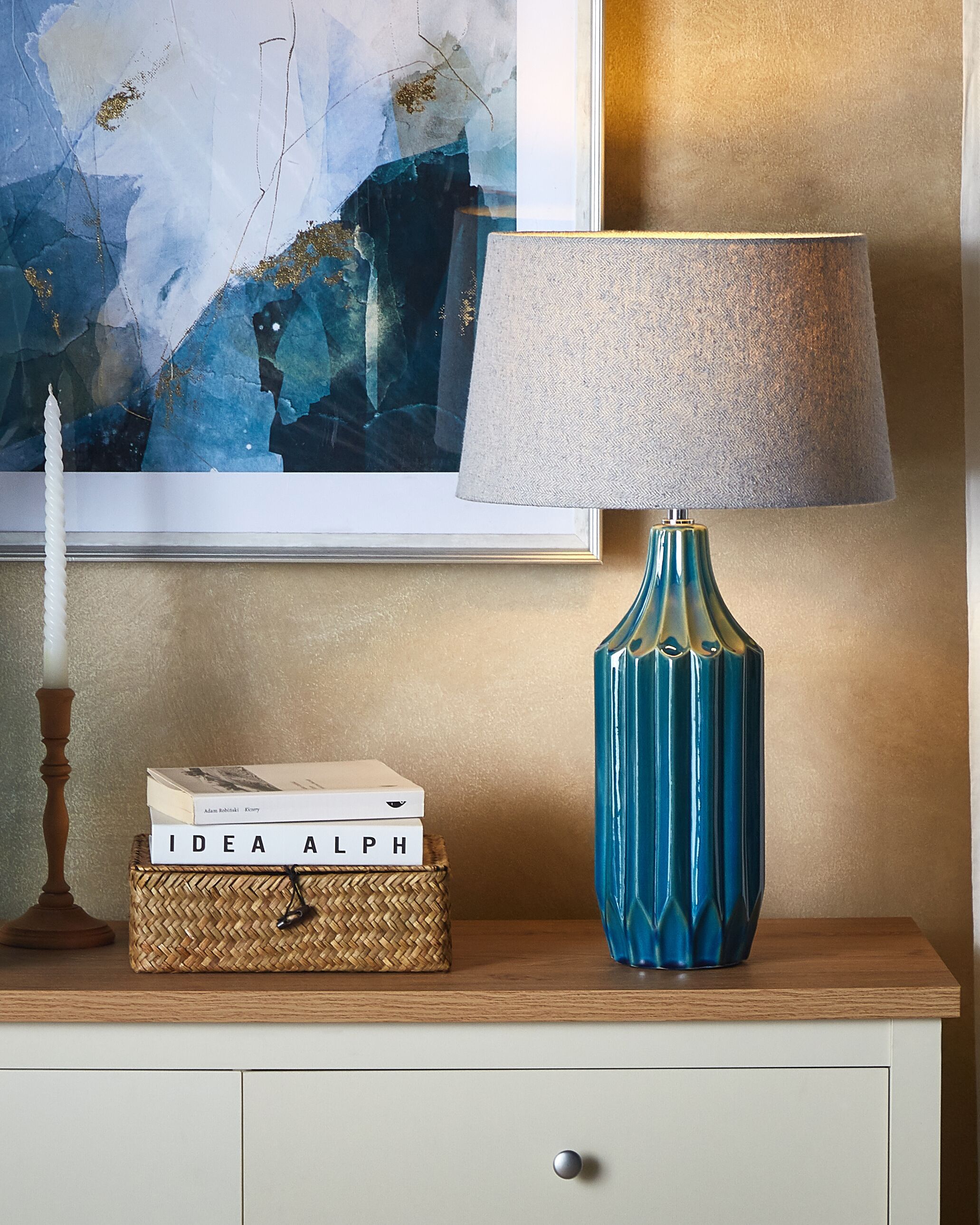 Elegantti kohojuovainen valaisin. Tämä sinivihreä pöytävalaisin on koristeellinen lisä mille tahansa yöpöydälle, senkille tai lipastolle. Valaisimen keraaminen jalka on viimeistelty kohojuovilla, jotka antavat sille elegantin ilmeen. Varjostin on valmistettu pellavan ja puuvillan sekoituksesta. Kaunis, kiiltävä jalka korostaa valaisimen vaaleanharmaata varjostinta täydellisesti luoden korosteen, joka sopii loistavasti moniin erilaisiin sisustuksiin.