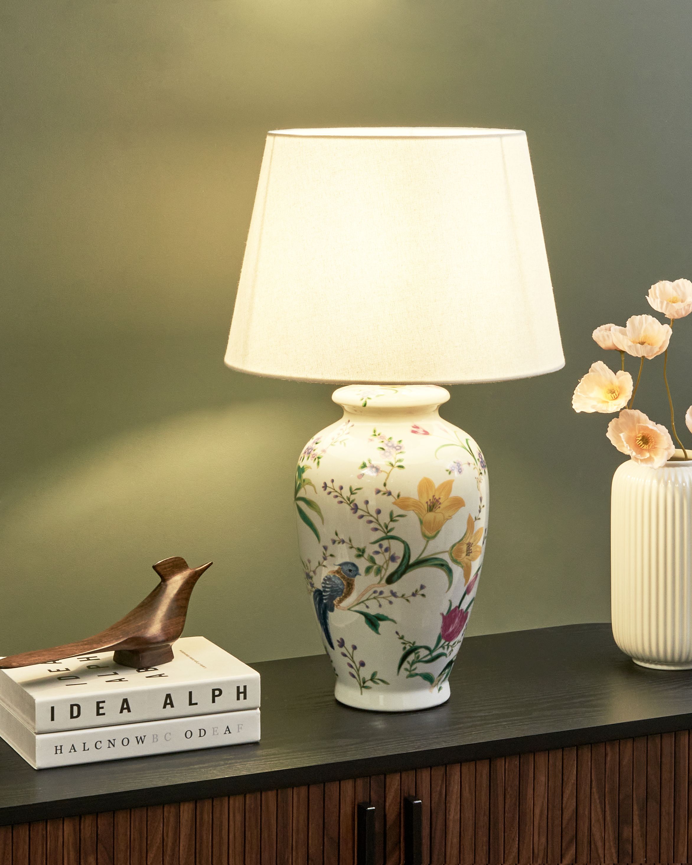 Välimerellinen valaisin kukkakuviolla. Tämä pöytävalaisin tuo kotiisi tyyliä ja käytännöllisyyttä. Valaisimessa on viehättävällä monivärisellä kukkakuviolla koristeltu posliinijalusta sekä pellavavarjostin, ja se antaa pehmeää, kutsuvaa valoa. Tämä pöytävalaisin on ihanteellinen tilasi kauneuden korostamiseen ja palvelee myös toiminnallista tarkoitusta.