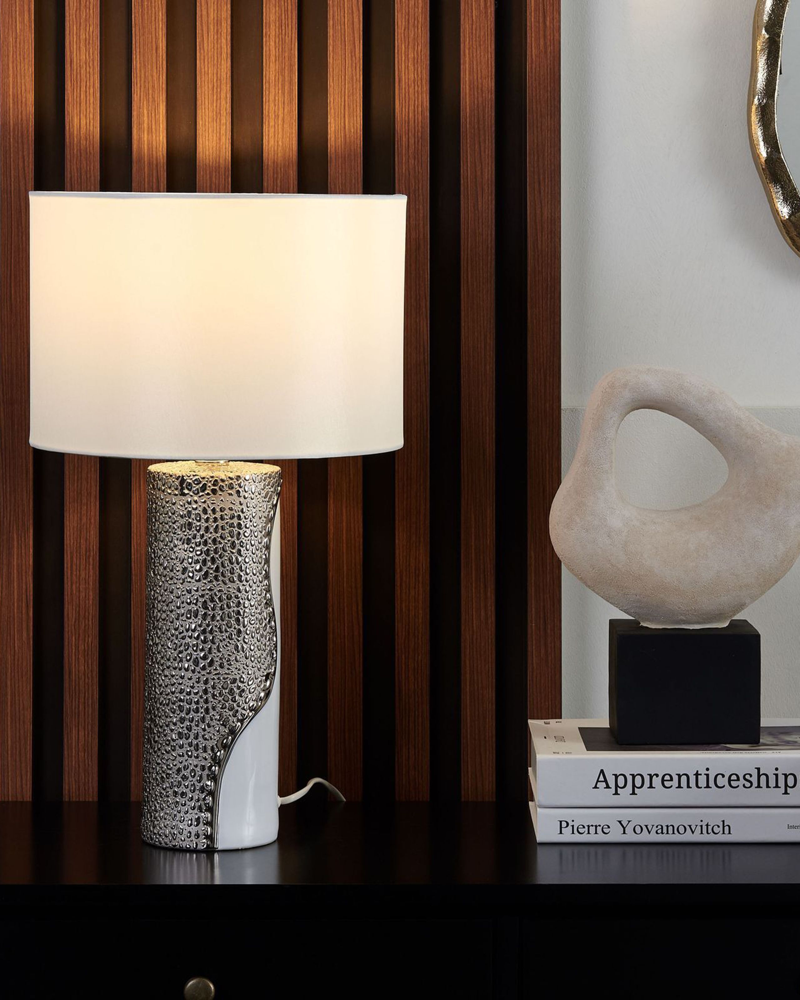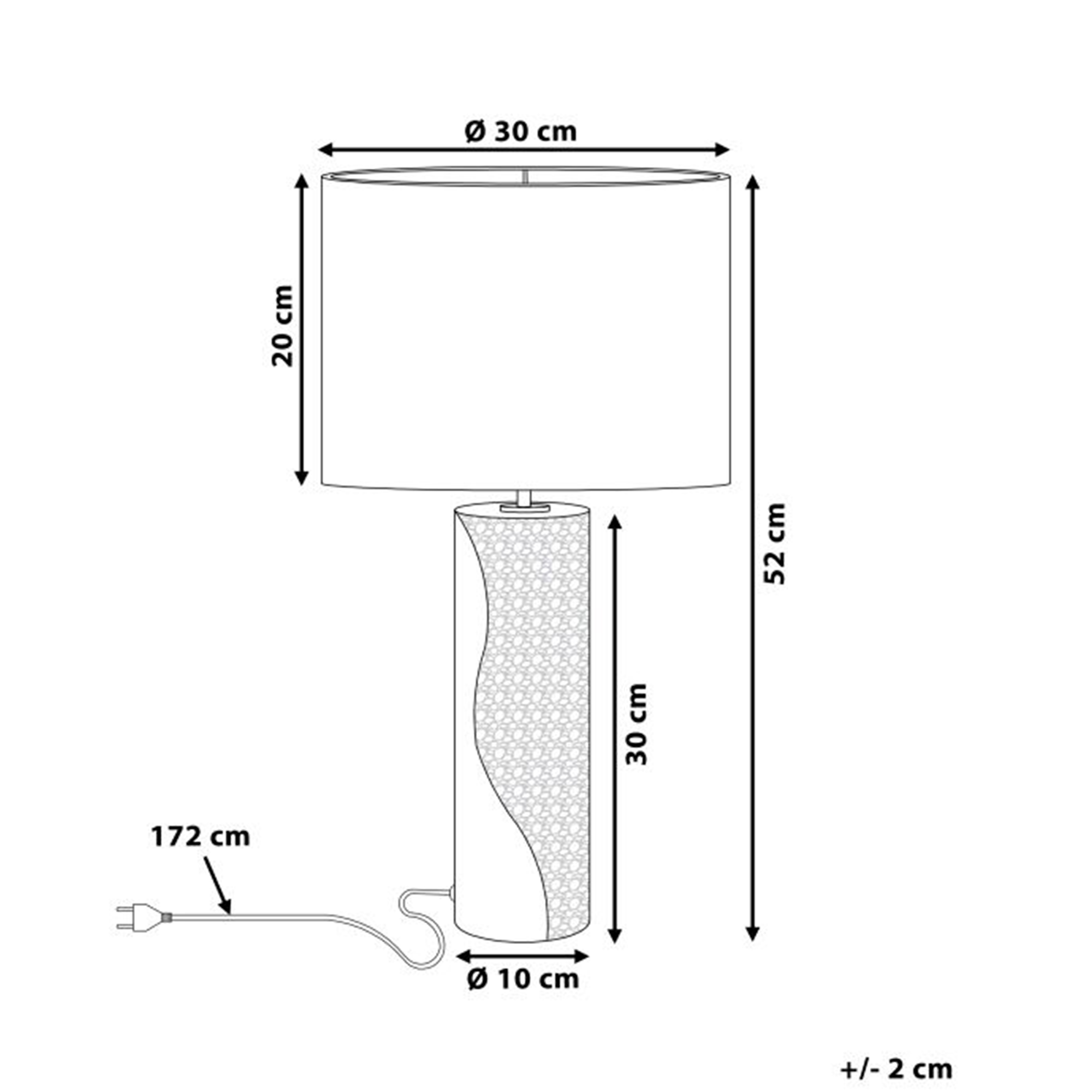 Elegantti yöpöydän valaisin. Tämä valaisin on ihanteellinen mihin tahansa nykyaikaiseen sisustukseen. Siinä on korkealaatuisesta posliinista valmistettu pyöreä, valkoinen jalka, jossa on hopea kuviointi. Lampunvarjostin on valmistettu kiiltävästä keinosilkistä, joka tuo ripauksen eleganssia ja ylellistä tunnelmaa huoneeseen. Valaisimeen kuuluu 172 cm pitkä johto, jossa on katkaisija.
