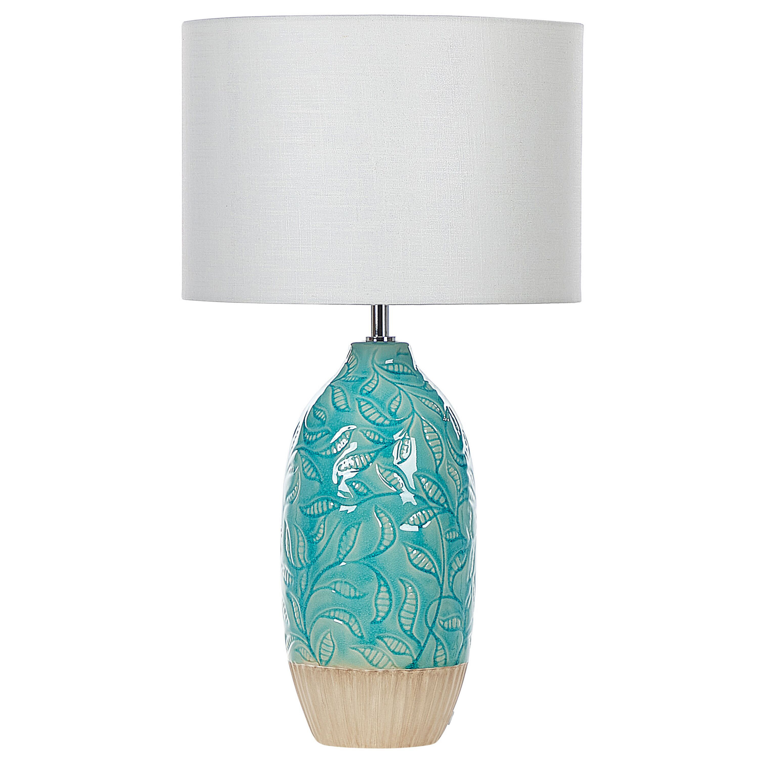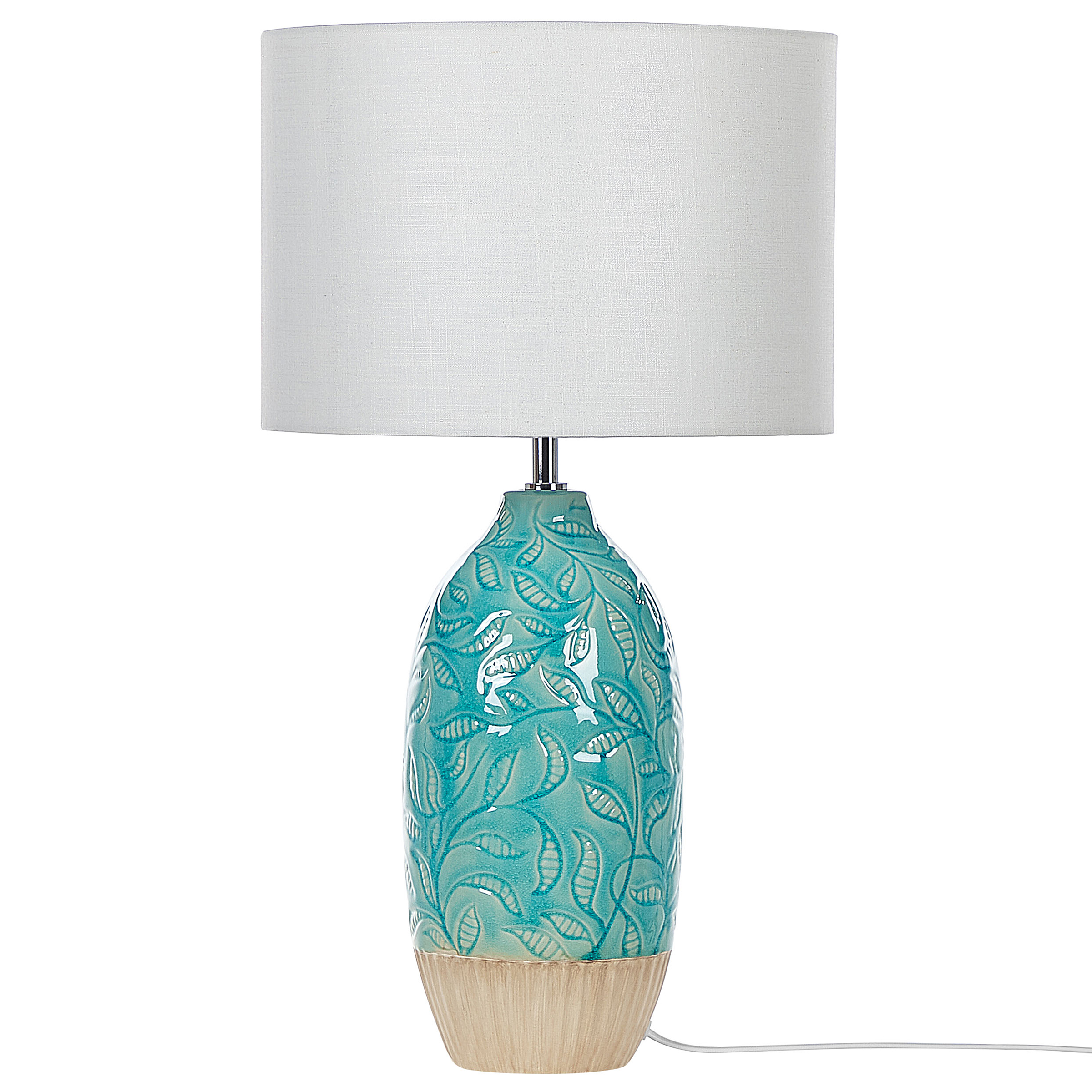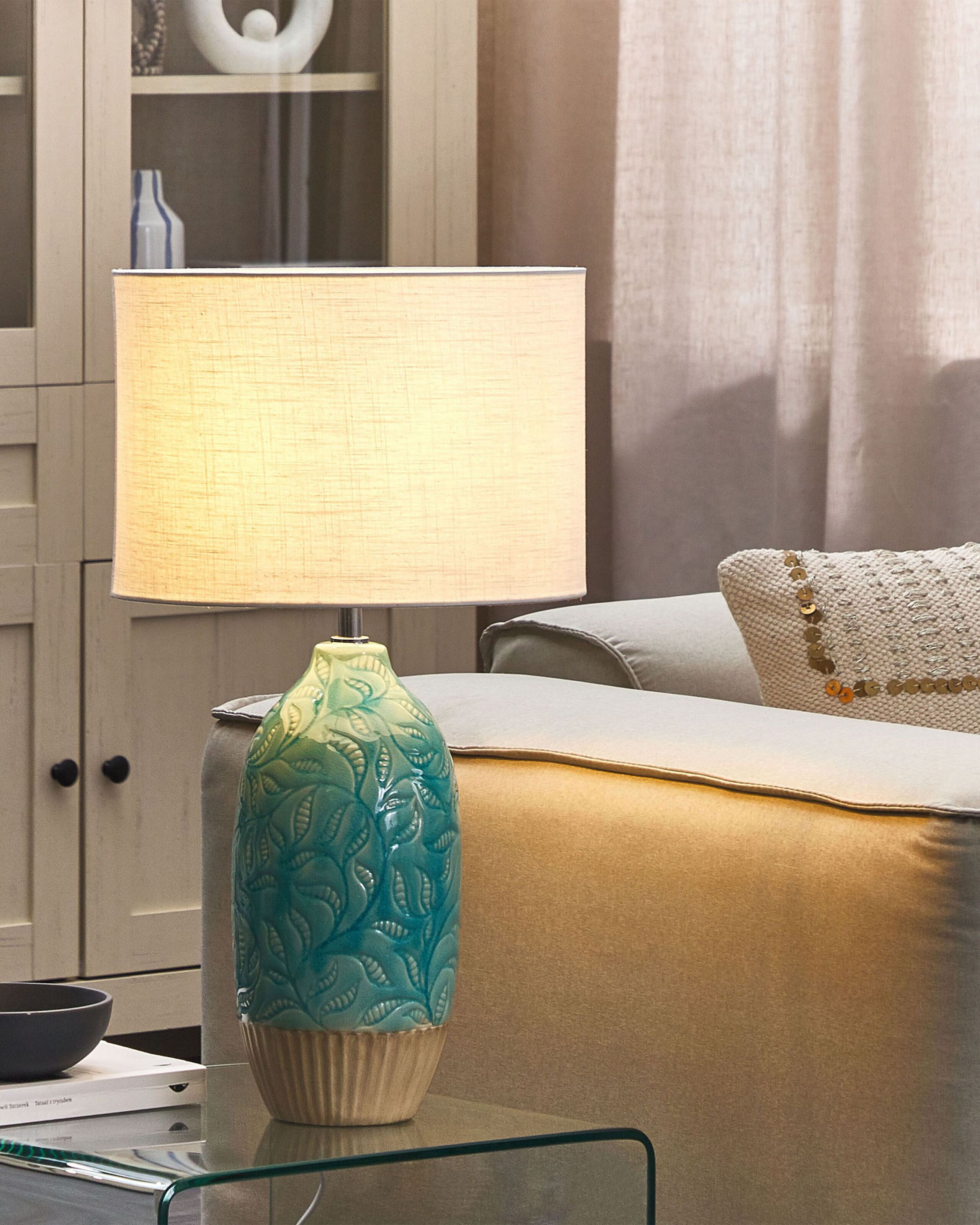 Välimerellinen valaisin koristellulla jalalla. Lisää kotiisi väriä tämän koristeellisen pöytävalaisimen avulla. Sen jalka on valmistettu kestävästä keramiikasta, jossa on lehtikaiverruksia. Tämän ansiosta valaisin sopii loistavasti mihin tahansa maalaismaiseen tai boho-tyyliseen sisustukseen. Sen turkoosi väri kerää varmasti katseita ja yhdessä valkoisen käsintehdyn varjostimen kanssa se muodostaa todella upean yhdistelmän. Lisää yöpöydälle makuuhuoneeseen tai sivupöydälle olohuoneeseen.