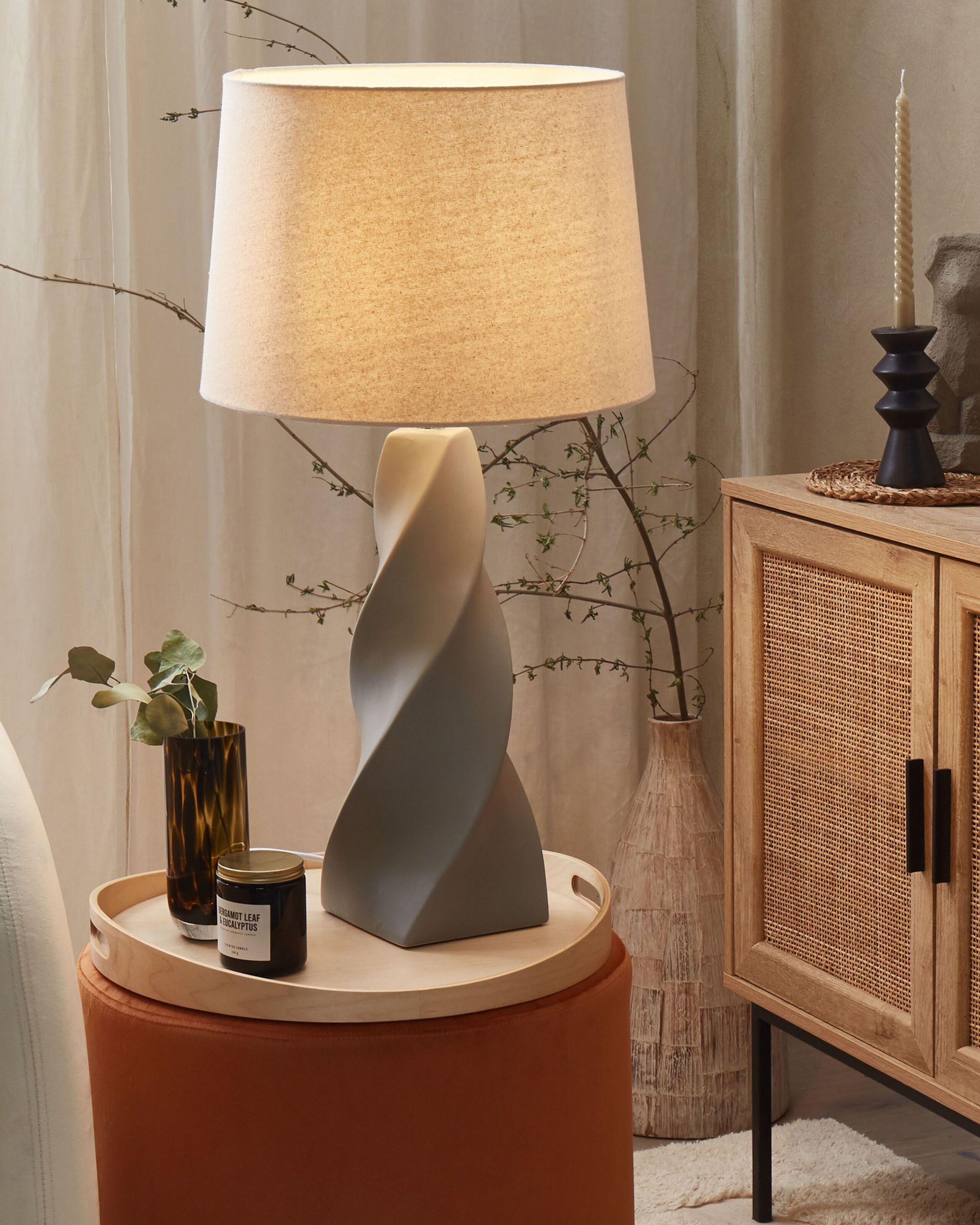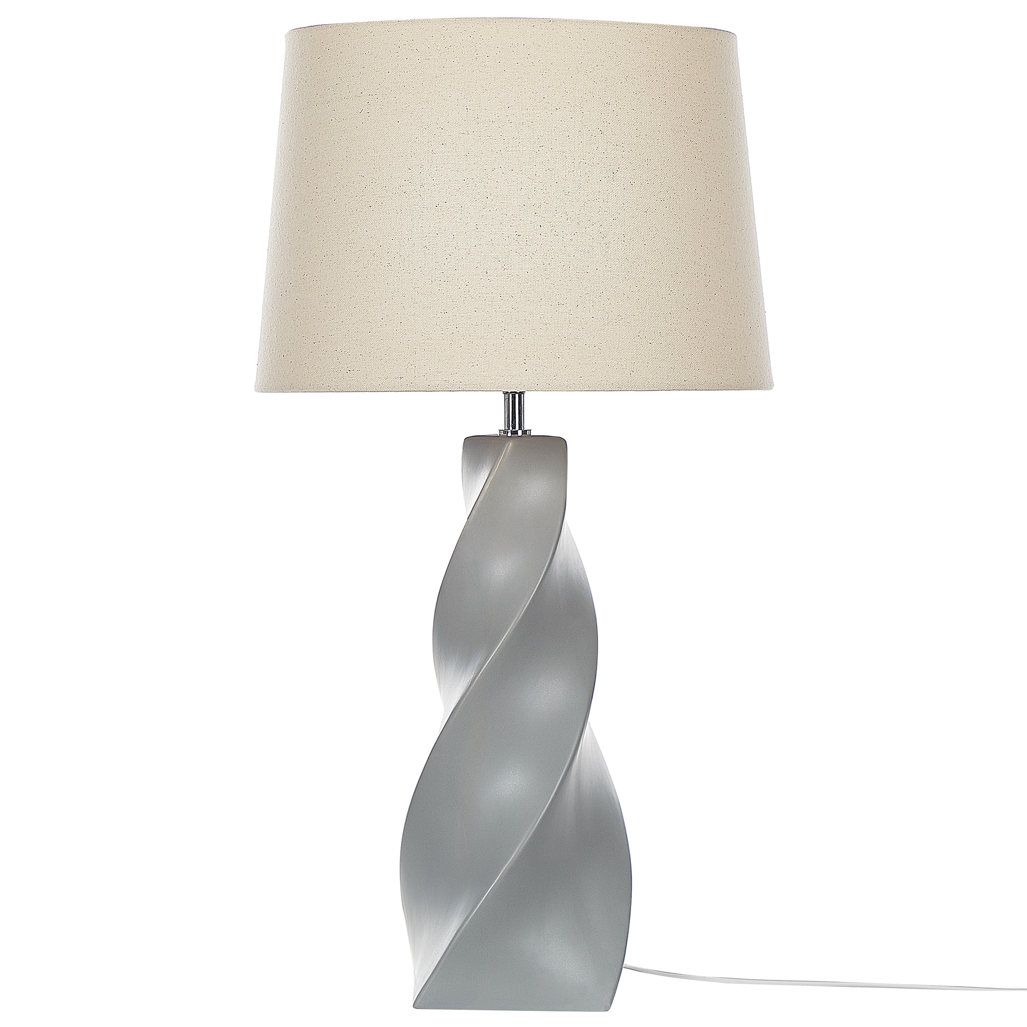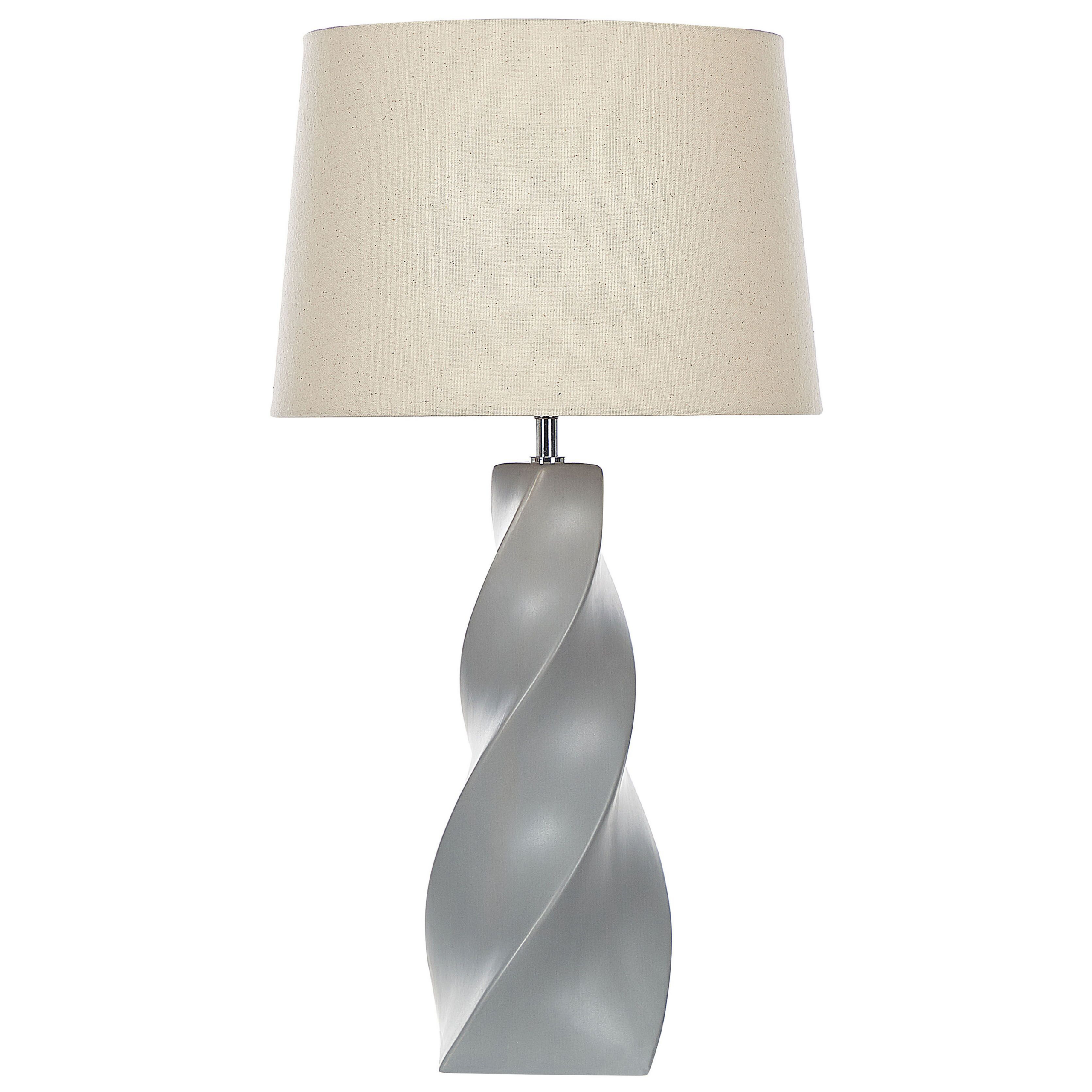 Kierrejalkainen pöytälamppu. Kaipaatko katseita kiinnittävää elementtiä sisustukseesi? Tämä upea kierrevalaisin toimii aksenttikappaleena sisustuksessa kuin sisustuksessa, luoden rentouttavaa lämpimän sävyistä valoa hämärtyviin iltoihin. Valaisimen jalka on hopeanharmaaksi maalattua keramiikkaa ja lampunvarjostin on valkoista kangasta.