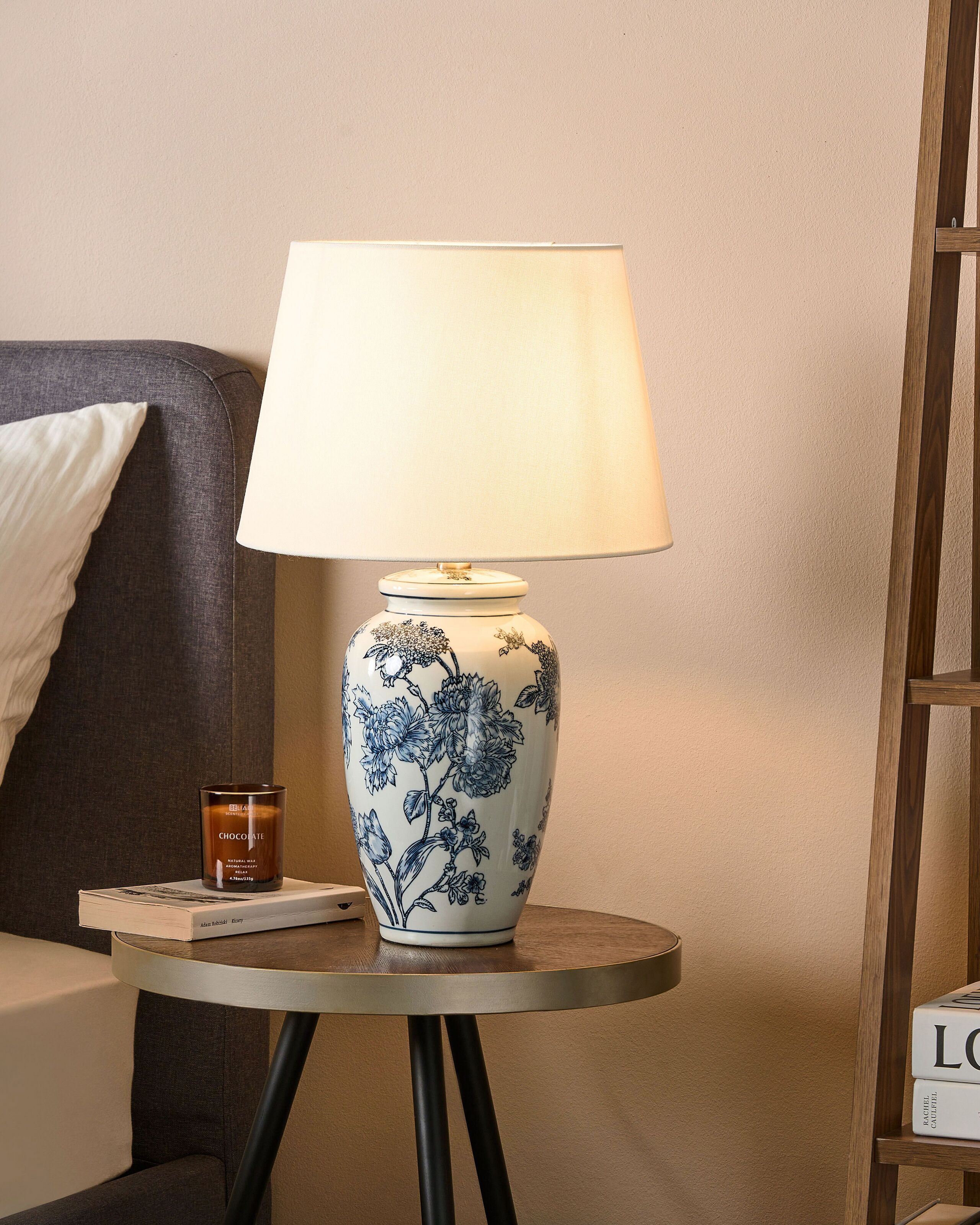 Perinteinen kuvioitu yöpöydän valaisin. Valaise tilasi tällä pöytävalaisimella, jossa on kaunis käsin maalattu kuviointi. Siinä on posliinista valmistettu jalka ja pellavakankainen varjostin, minkä ansiosta se sopii erinomaisesti minkä tahansa tyylisiin sisustuksiin. Valaisin on sekä tyylikäs että käytännöllinen, ja sen päivittäinen ylläpito on helppoa.