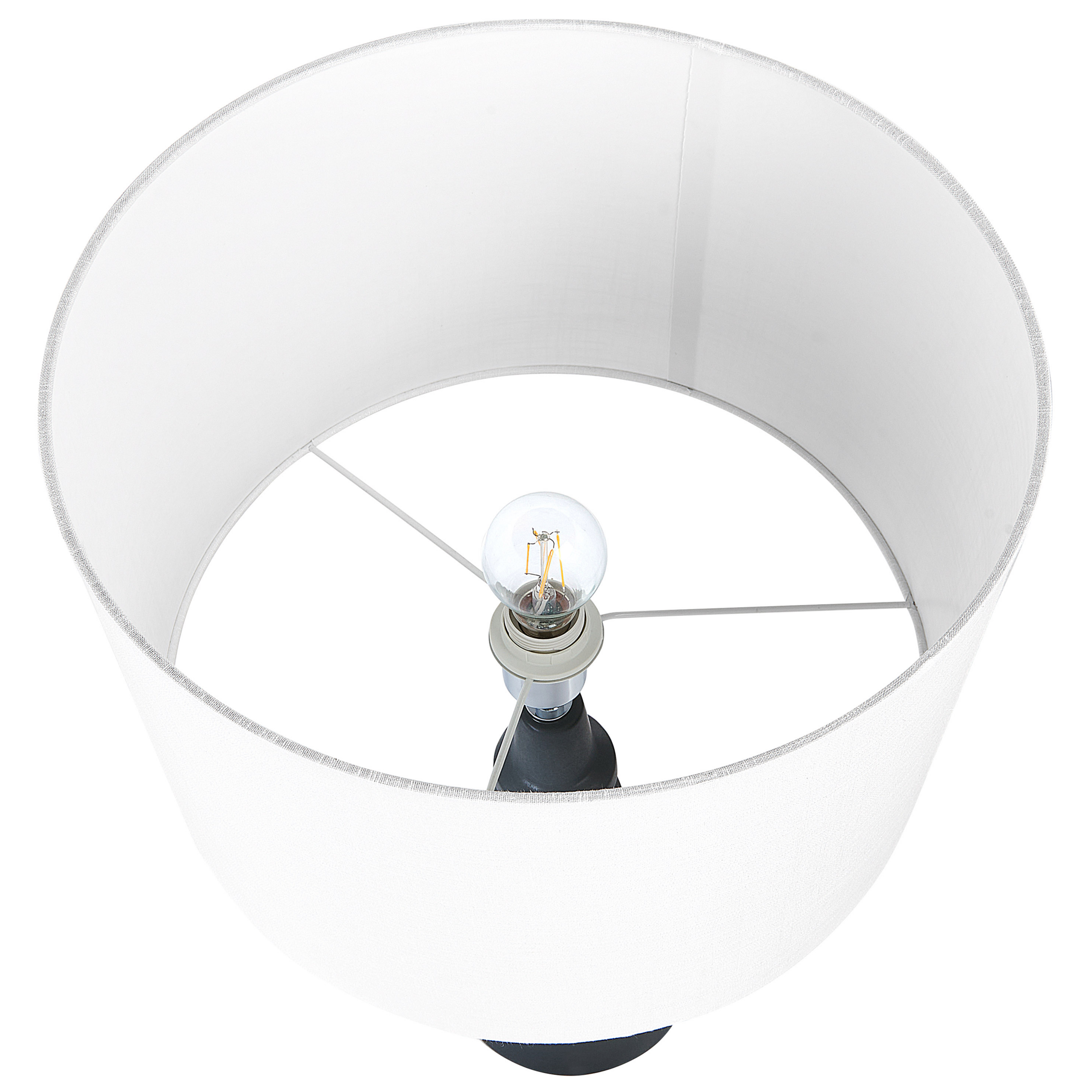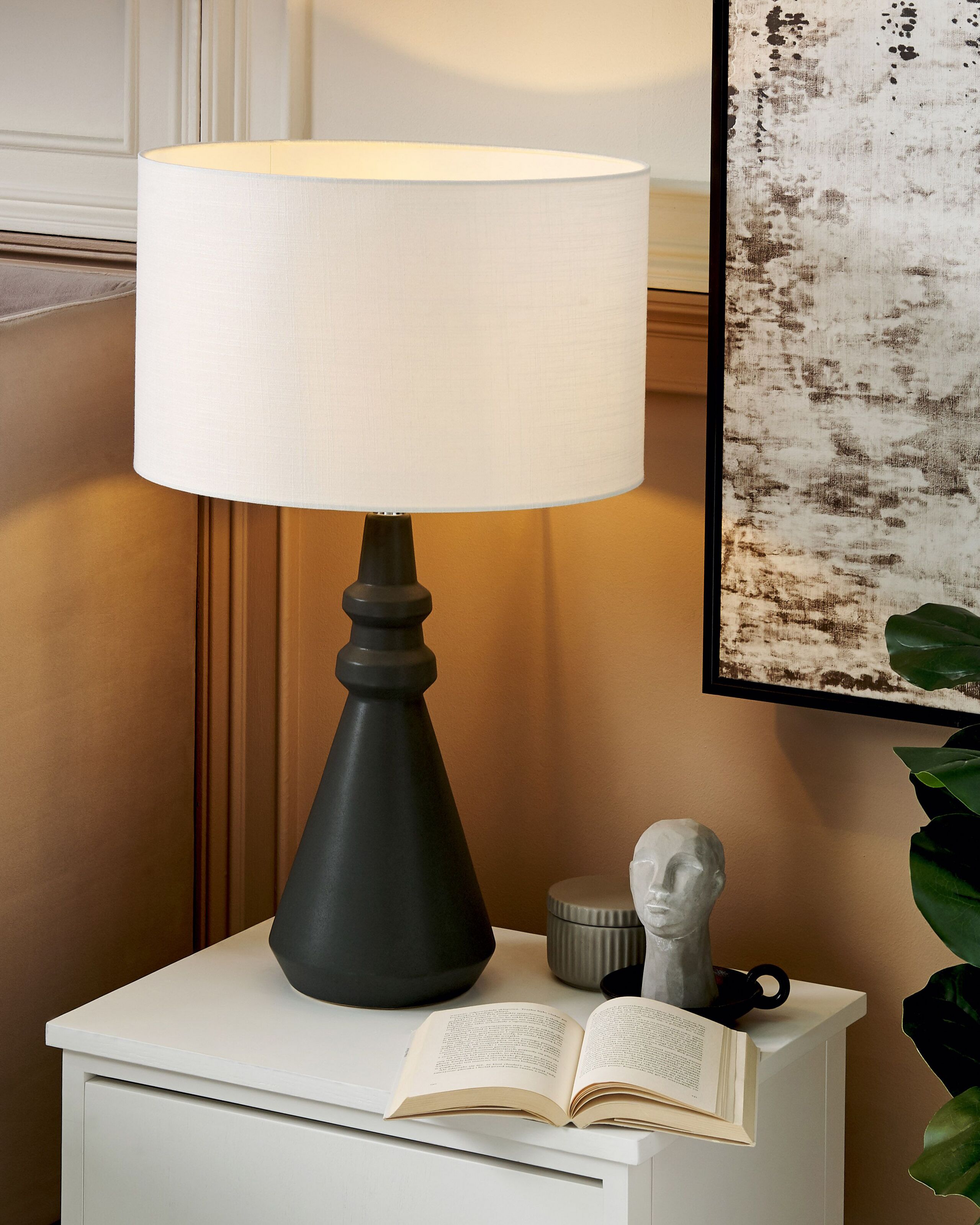 Moderni yöpöydän valaisin tyylikkäällä jalalla. Tämän käsintehdyn valaisimen moderni mutta ajaton ilme sopii loistavasti mihin tahansa makuuhuoneeseen tai olohuoneeseen. Musta keraaminen jalka ja valkoinen pellavan sekä puuvillan sekoituksesta valmistettu varjostin korostavat toisiaan kauniisti. Materiaaliensa ansiosta varjostin luo ympäristöönsä pehmeän ja hellävaraisen hajavalon. Jalan geometrinen, maljakkoa muistuttava muoto tekee valaisimesta kauniin, katseita keräävän korosteen.