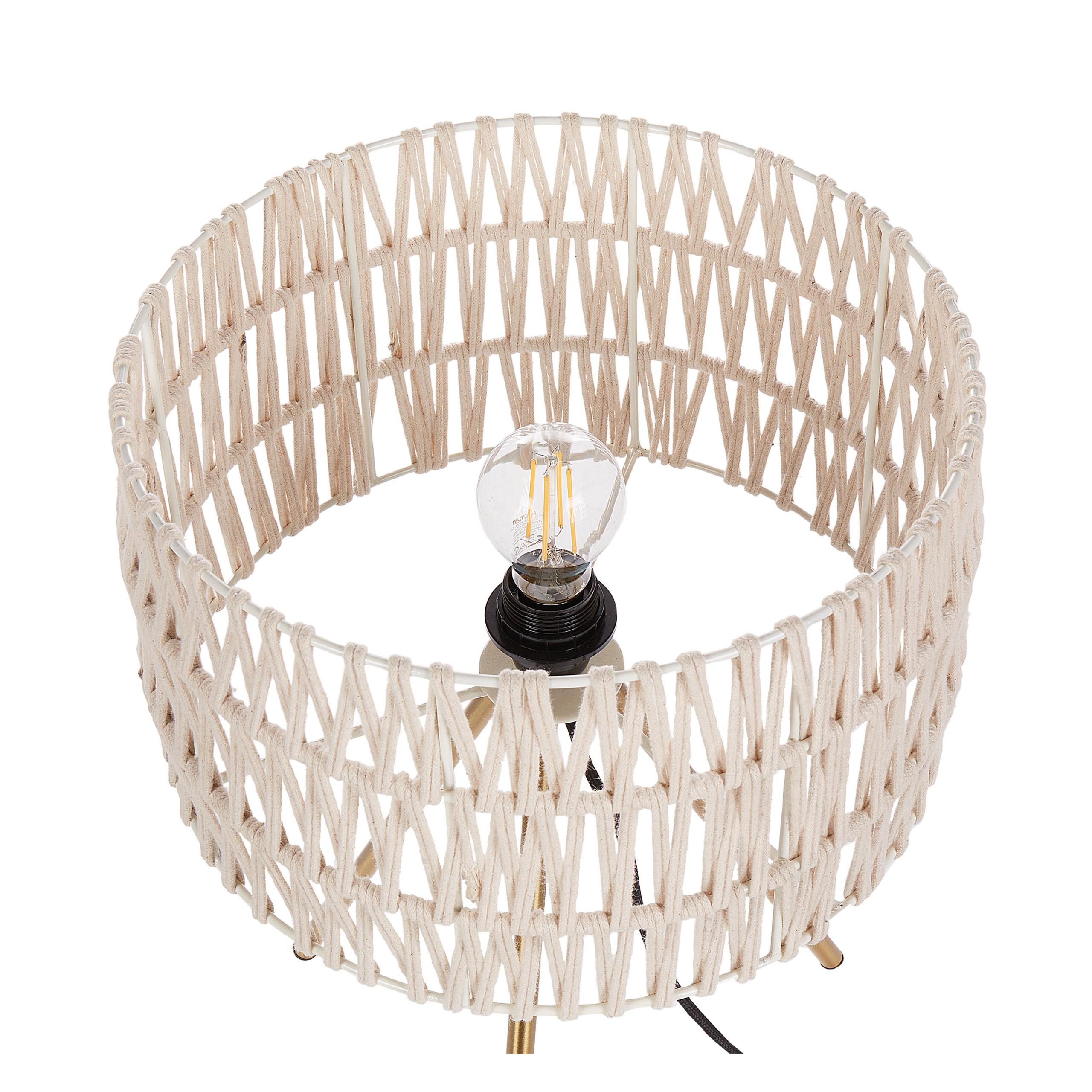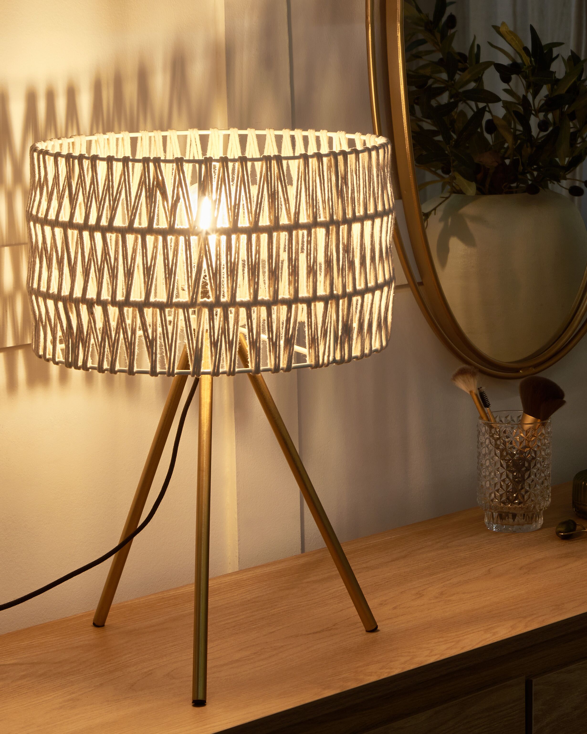 Moderni kolmijalkainen valaisin. Tämä pöytävalaisin on täydellinen yhdistelmä rustiikkista charmia ja modernia muotoilua. Sen beigestä puuvillasta käsin valmistettu sylinterivarjostin luo päälle kytkettynä kiehtovan leikin valon ja varjon välillä avoimen muotoilunsa ansiosta. Valaisin on tuettu kolmella sirolla, kultaisella rautajalalla, jotka antavat sille nykyaikaisen ja minimalistisen ilmeen. Valaisin ei ole vain valonlähde, vaan myös näyttävä sisustuselementti, joka täydentää vaivattomasti mitä tahansa tilaa.